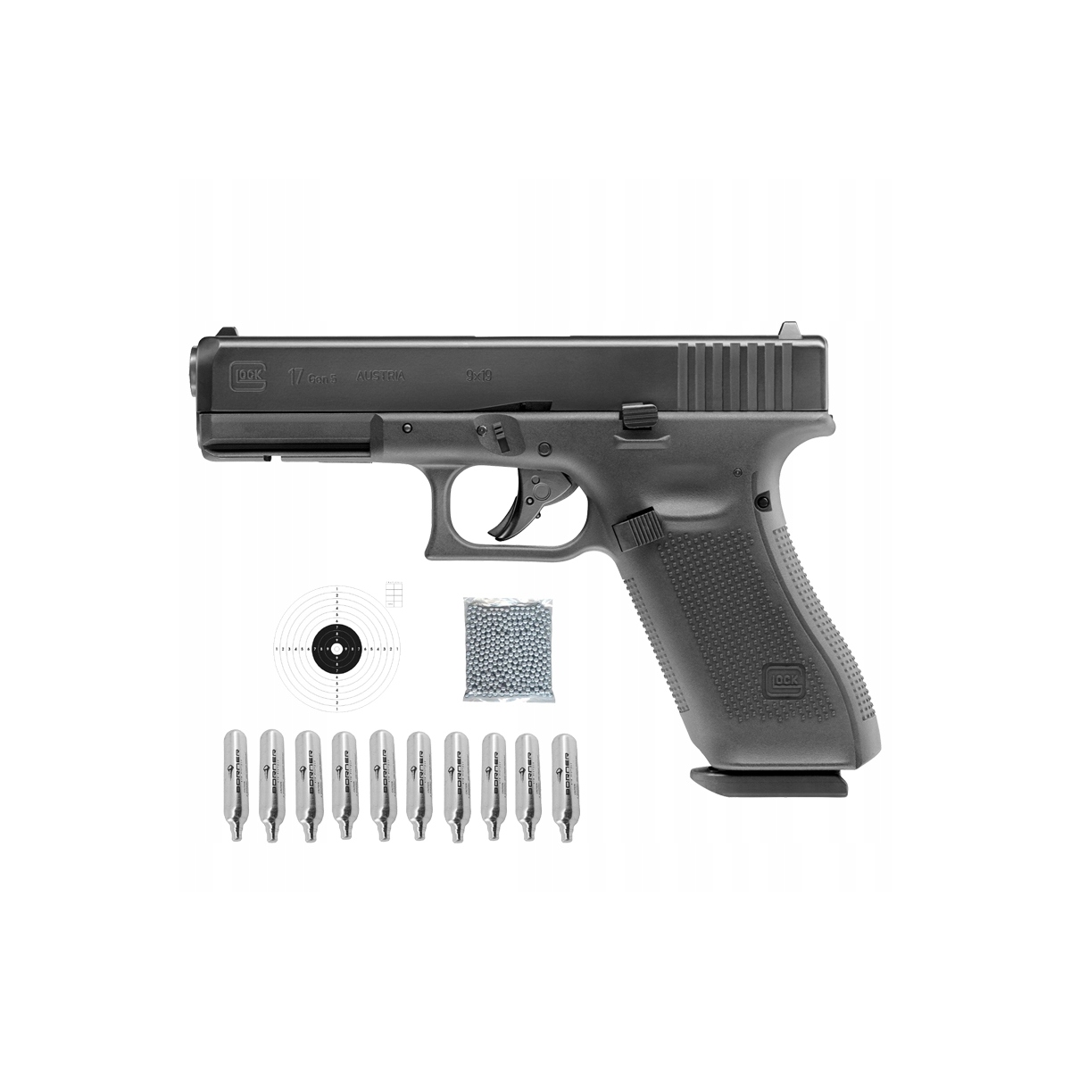 Zestaw zawiera: Wiatrówka Glock 17 gen 5, 20 tarcz, 10 naboi CO2 oraz 500 szt śrutu BB.