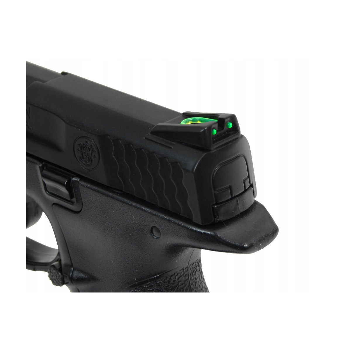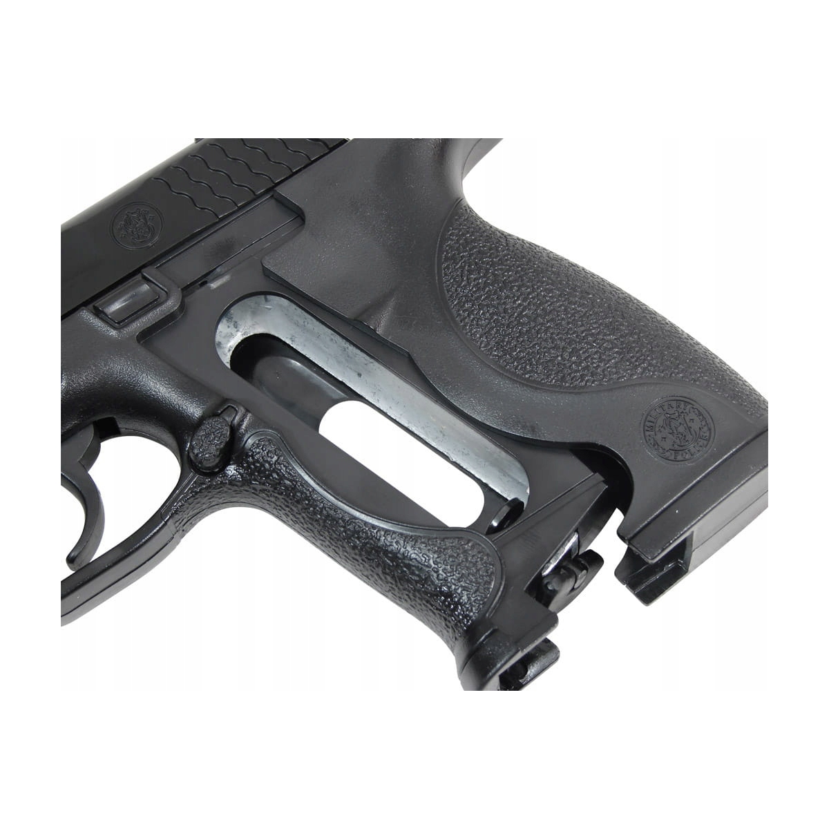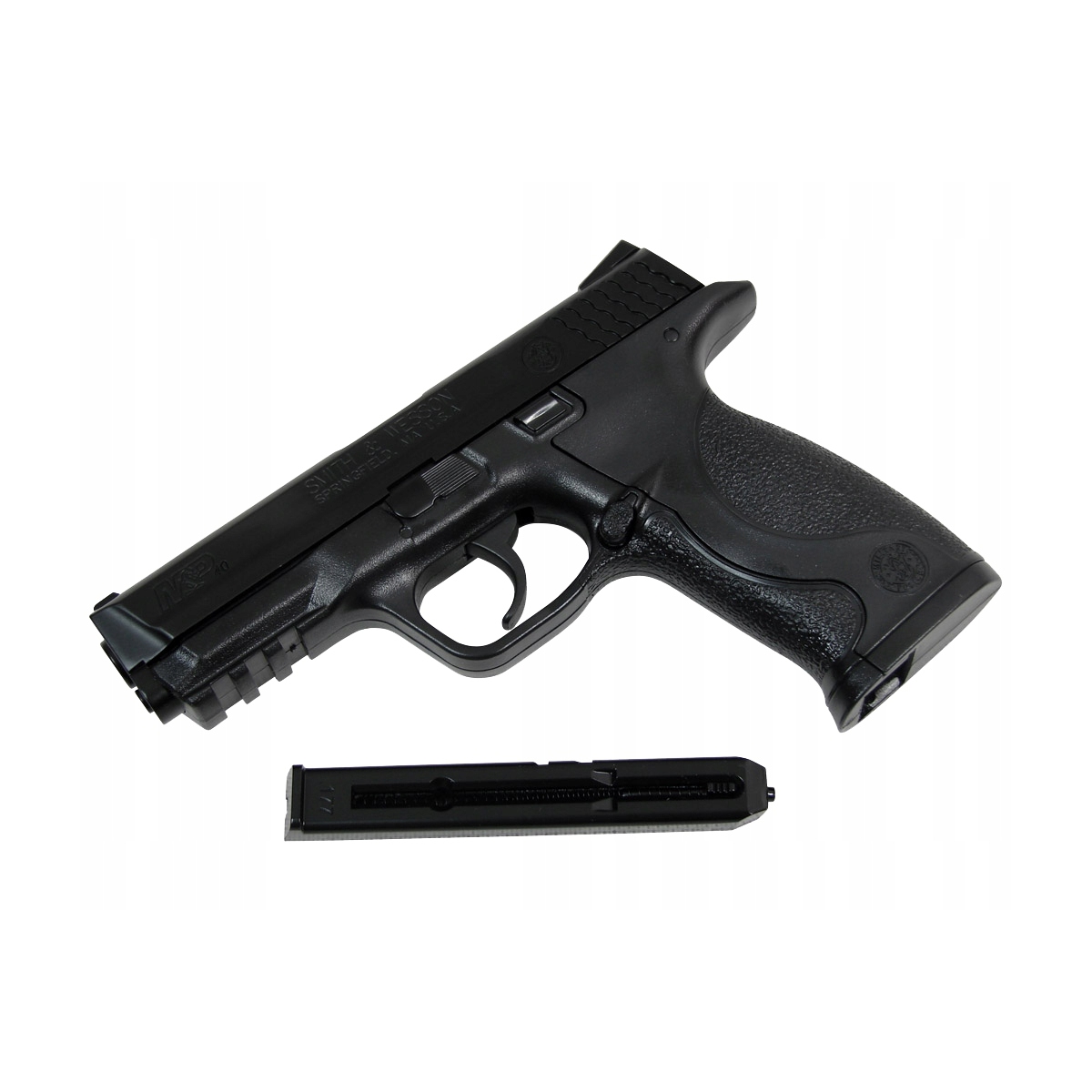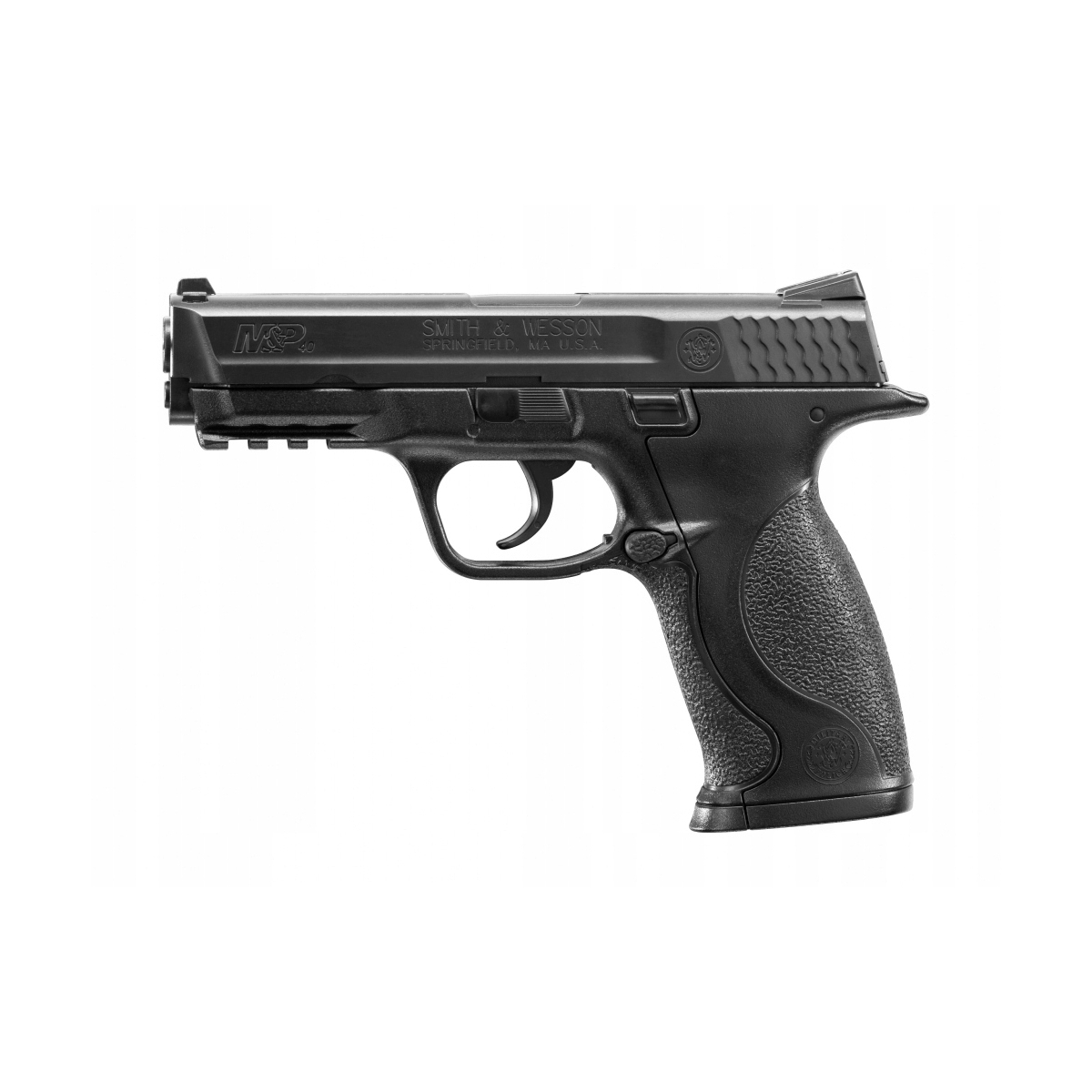 Rewolwer Smith&Wesson M&P 40 - replika pneumatyczna, licencjonowana replika pistoletu znanego amerykańskiego producenta broni, firmy Smith&Wesson. Szkielet wiatrówki wykonano z wytrzymałego tworzywa ABS, które doskonale imituje oryginalne polimery stosowane we współczesnej broni palnej. Pokrywa zamka, lufa, mechanizmy wewnętrzne oraz wymienny magazynek pudełkowy zostały wykonane z metalu.