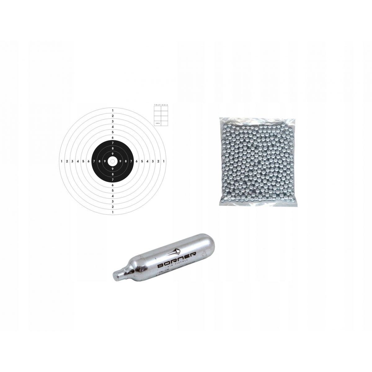 - Gratis: 20 tarcz strzeleckich, nabój CO2 oraz 250szt śrutu BB.