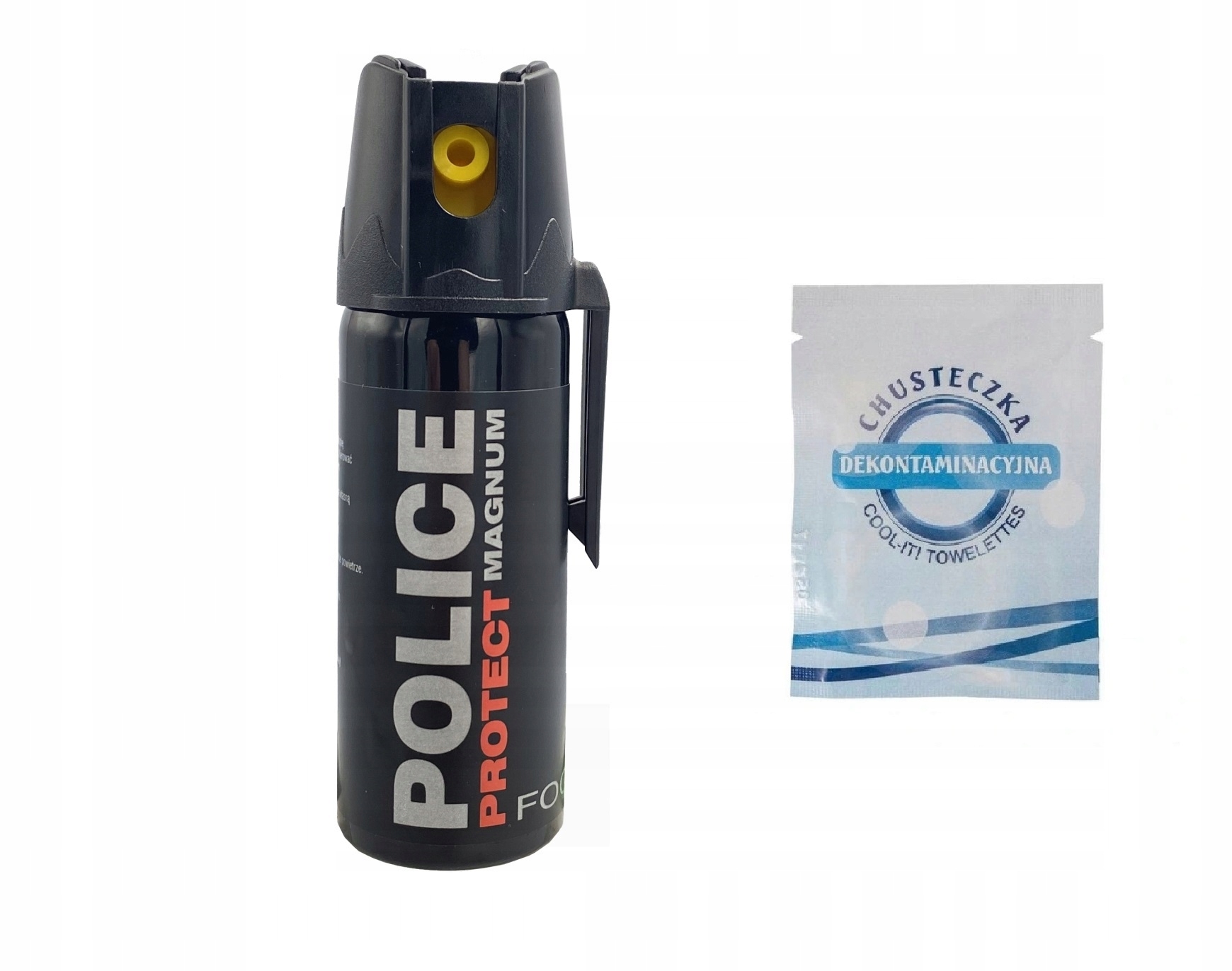 W komplecie: gaz pieprzowy Police Protect Magnum FOG 50ml + Chusteczka dekontaminacyjna