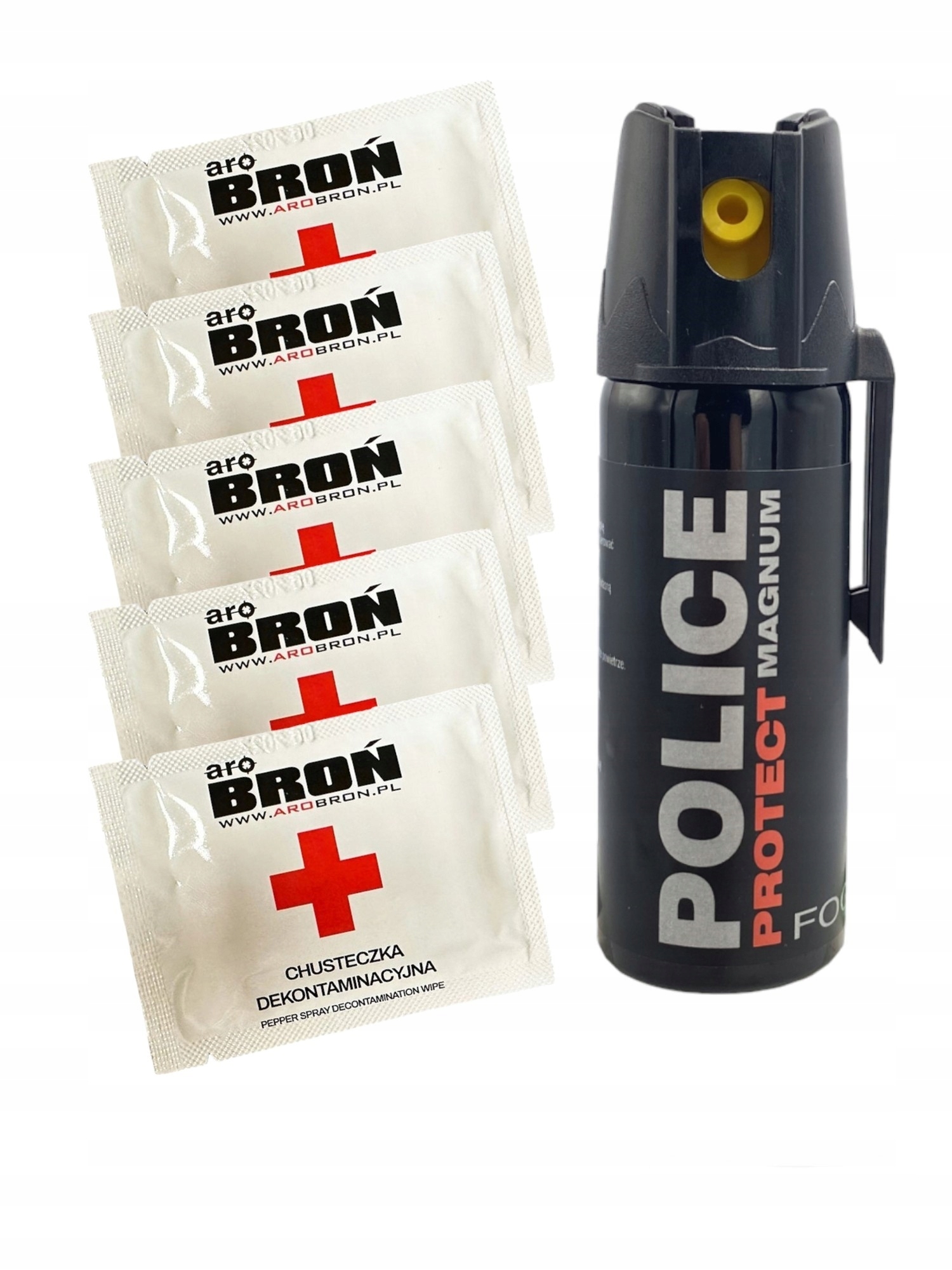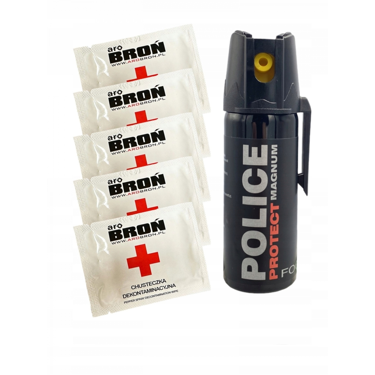 Zestaw zawiera: gaz pieprzowy POLICE PROTECT Magnum Fog 50 ml + 5 chusteczek neutralizujących gaz Aro Broń