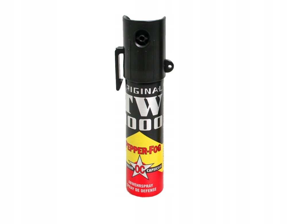 Gaz pieprzowy TW1000 FOG 20ml - mały, poręczny pojemnik z gazem obronnym na bazie środka biologicznego Alkaloidu w formie stożka chmury, wyprodukowany przez niemiecką firmę Hoernecke Chemie, o zwiększonym stężeniu gazu pieprzowego i przedłużonym czasie działania. Skuteczny także na osoby pod wpływem alkoholu i środków odurzających. Bezpośrednim efektem działania gazu jest paraliż układu oddechowego, pieczenie oczu, nosa oraz duszenie uniemożliwiające dalszy atak napastnika.