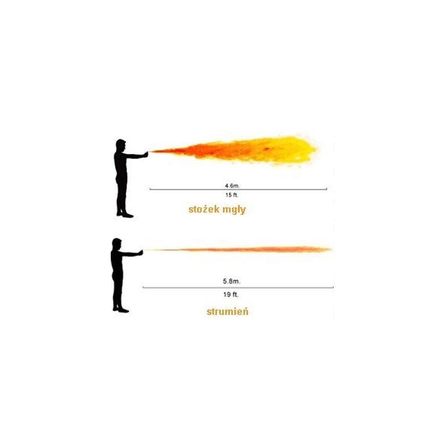 - Gaz pieprzowy o pojemności 43 ml rozpylany jest w formie stożka.