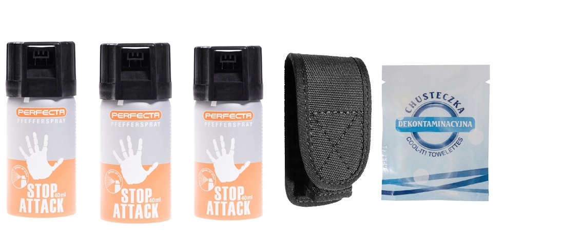 W zestawie: 3szt gazu Perfecta Stop Attack, 1szt kabury oraz 1szt chusteczki neutralizującej gaz.