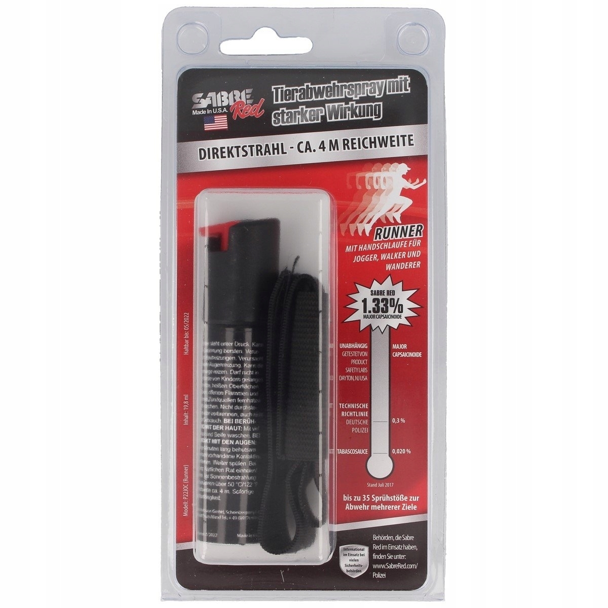 Red Sabre Jogger - poręczny pojemnik z obronnym gazem pieprzowym o silnym stężeniu kapsaicyny alkalidowej amerykańskiej firmy Sabre. Moc 2 000 000 mln SHU, środek drażniący 10% OC w tym 1,33% MC. Głowica - profilowany kształt chroni przed przypadkowym użyciem. Konstrukcja głowicy gwarantuje powtarzalność strumienia gazu (stały zasięg), ułatwiając skuteczną i efektywną obronę.