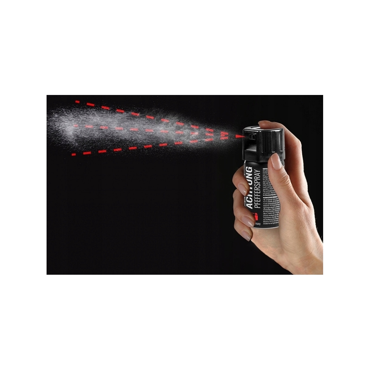 - W sytuacji zagrożenia wycelować w stronę linii oczu napastnika i zdecydowanie wcisnąć dźwignię.