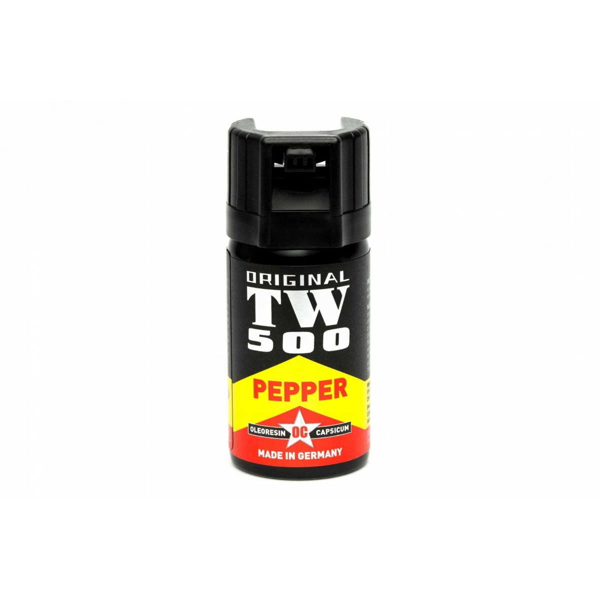 Gaz pieprzowy TW500 strumień 40ml - gaz obronny na bazie środka biologicznego Alkaloidu w formie strumienia, wyprodukowany przez niemiecką firmę Hoernecke Chemie. Skuteczny także na osoby pod wpływem alkoholu i środków odurzających. Bezpośrednim efektem działania gazu jest paraliż układu oddechowego, pieczenie oczu, nosa oraz duszenie uniemożliwiające dalszy atak napastnika.