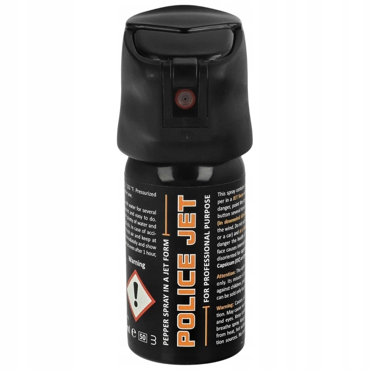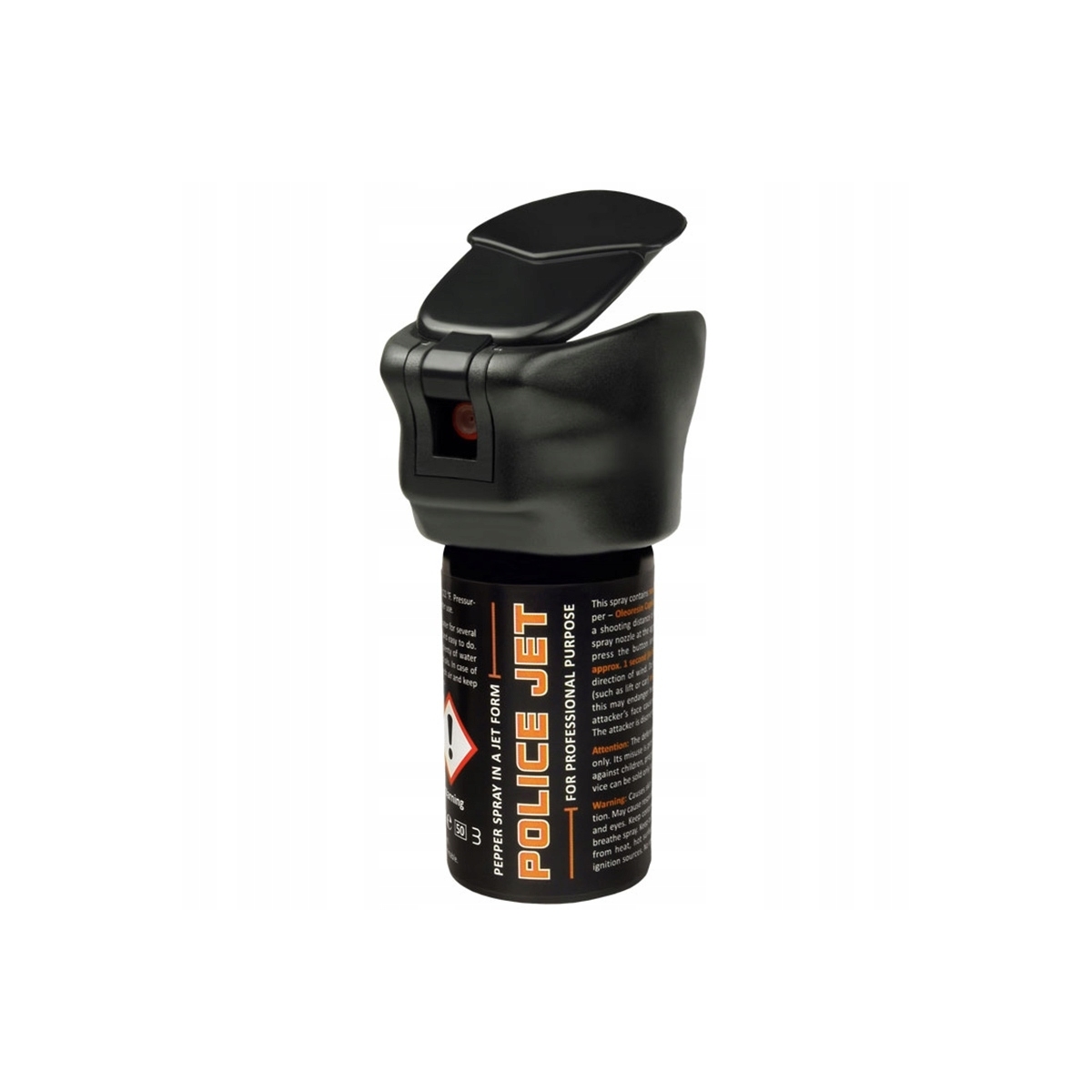 Police JET to gaz pieprzowy w strumieniu o podwyższonej zawartości substancji drażniącej. Zawiera 15% wysokiej jakości środka drażniącego OC (oleoresin capsicum) w tym 4% MC (Major Capsaicinoids), co finalnie przekłada się na 0,6% MC w wyrzucanej mieszance. Umożliwia skuteczną obronę przed napastnikami nawet pod wpływem alkoholu czy środkw psychoaktywnych.