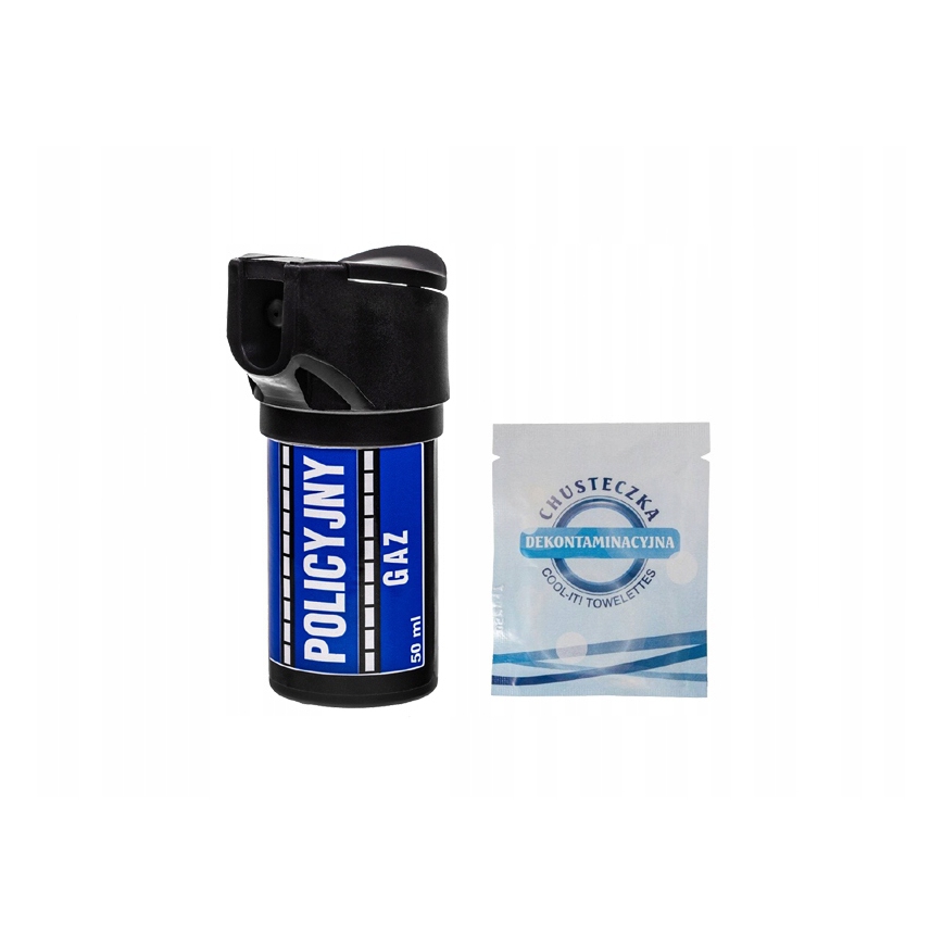 W komplecie: gaz pieprzowy Policyjny strumień 50ml + chusteczka dekontaminacyjna.