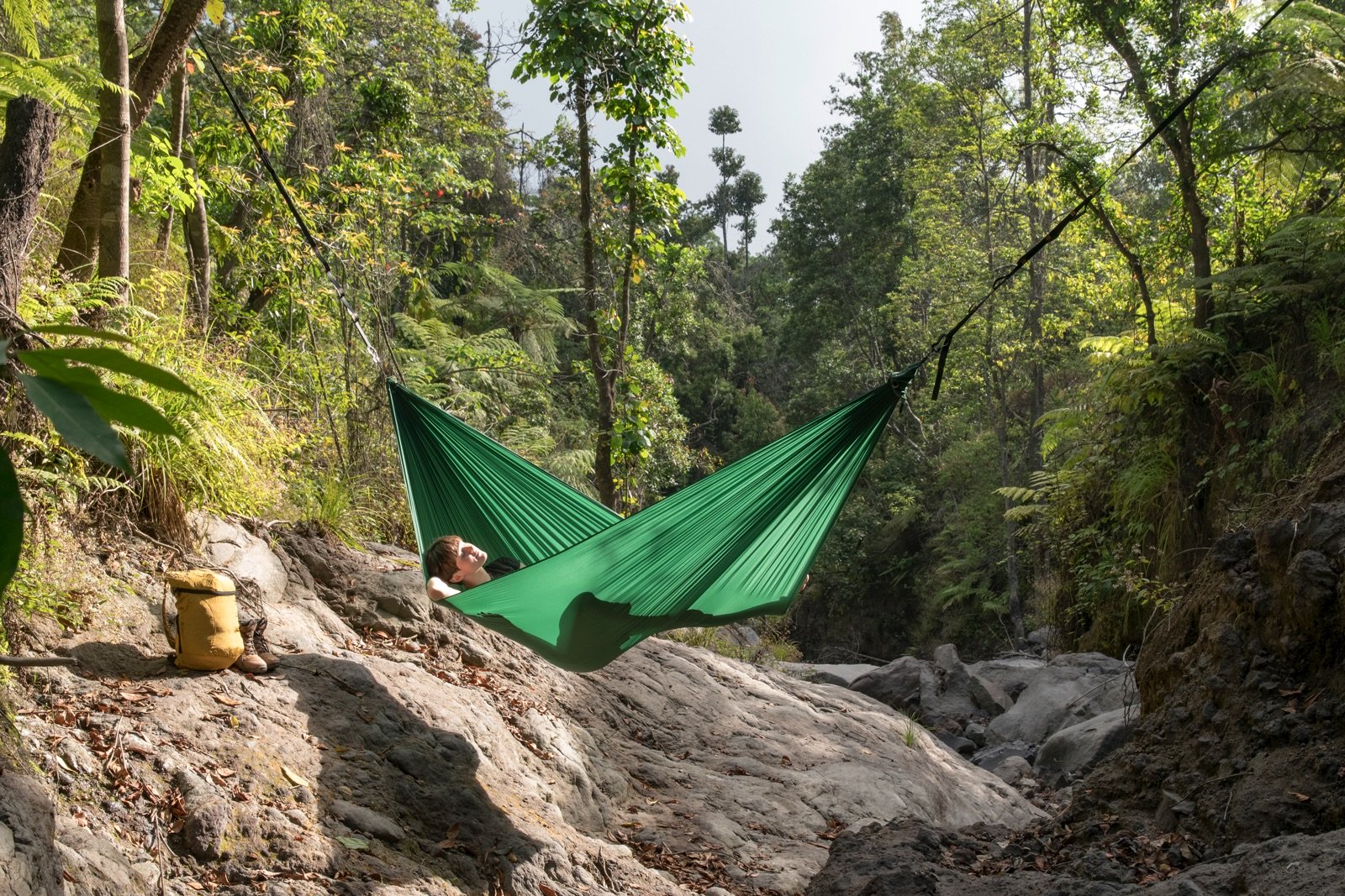 - Hamak wykonany z trwałej i mocnej codury spadochronowej.