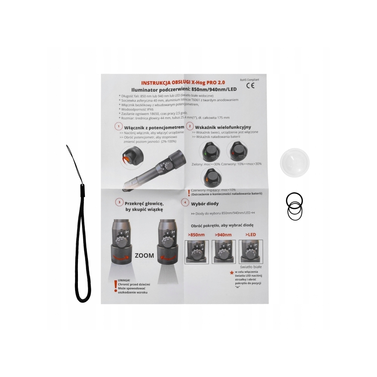 - Długość fali: Dual 850 nm oraz 940 nm (przełączane pokrętłem)