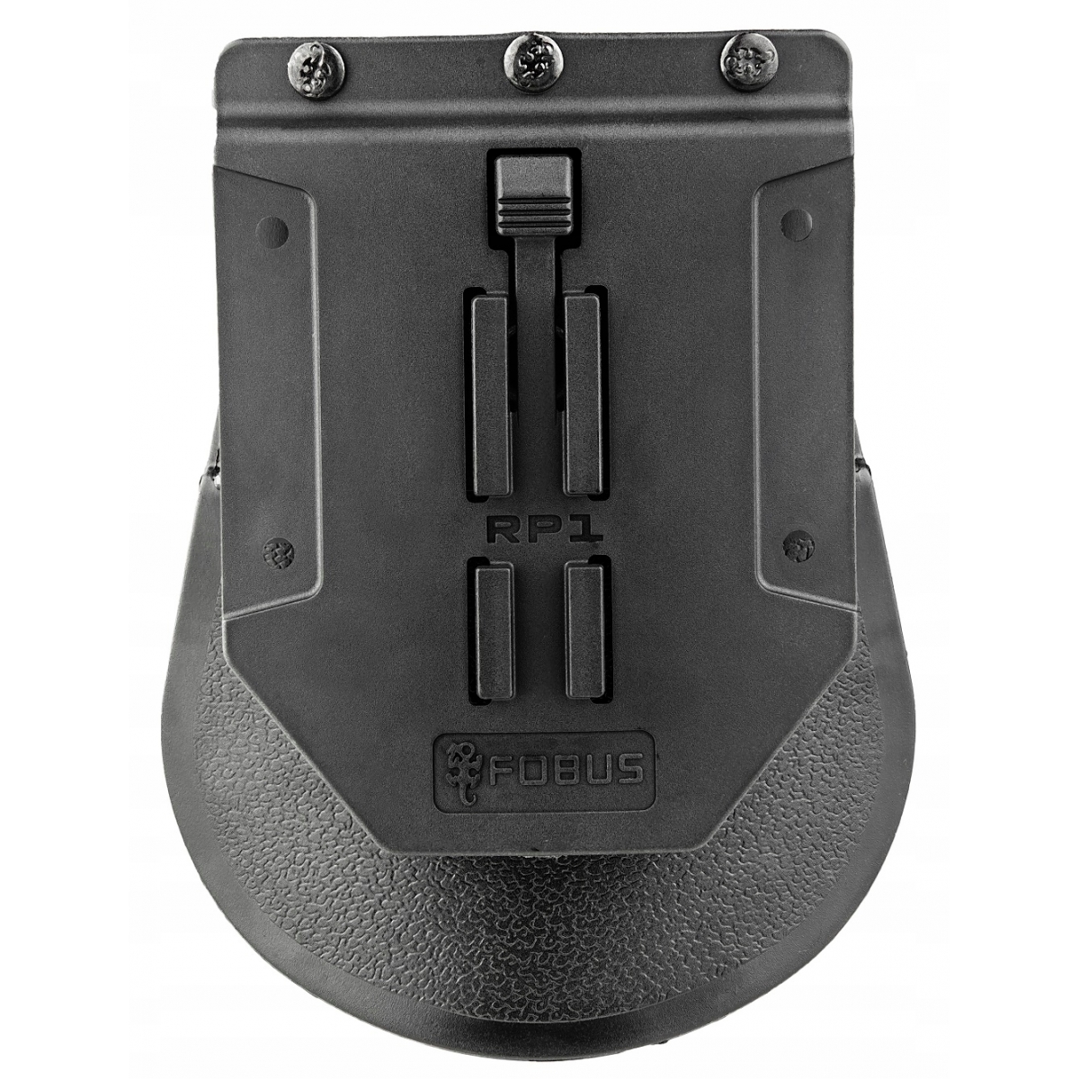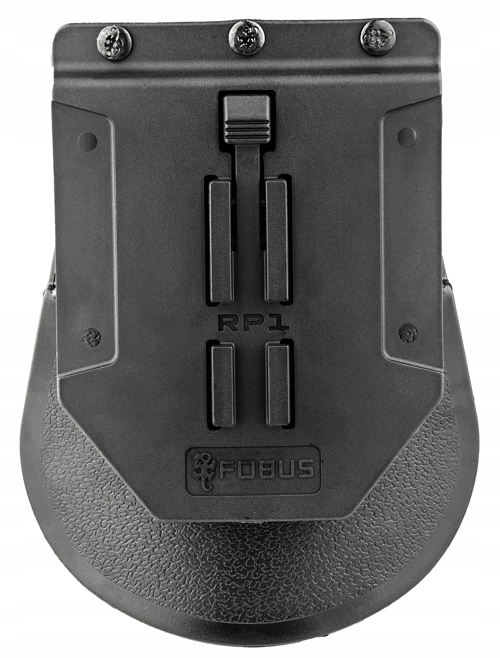 FOBUS RP1 - płetwa mocująca izraelskiego producenta Fobus, za pomocą której można zamontować dowolną kaburę lub ładownicę Fobusa, która posiada system RAIL Quick Lock. Wykonany metodą wtryskową z lekkiego i bardzo wytrzymałego polimeru. Stały kąt.