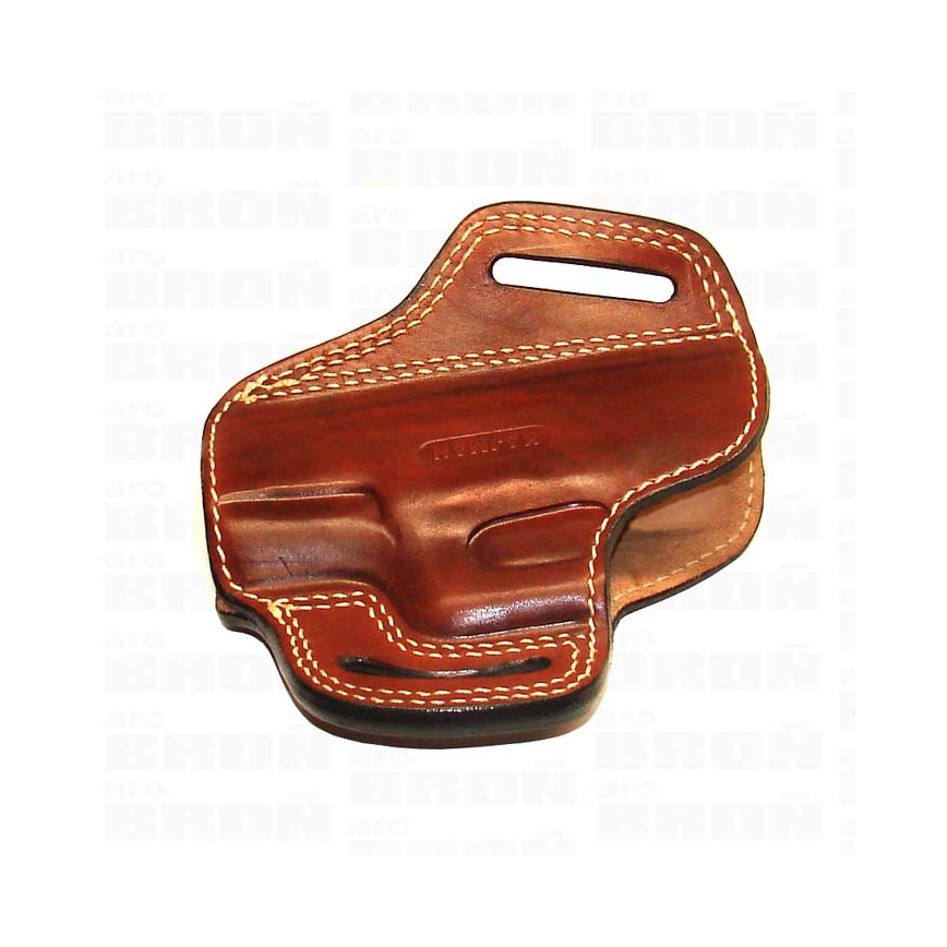 - Kabura w odpowiednim położeniu mocowana jest do pasa. Profilowana i odpowiednio wytłaczana kabura wykonana z prawdziwej skóry.