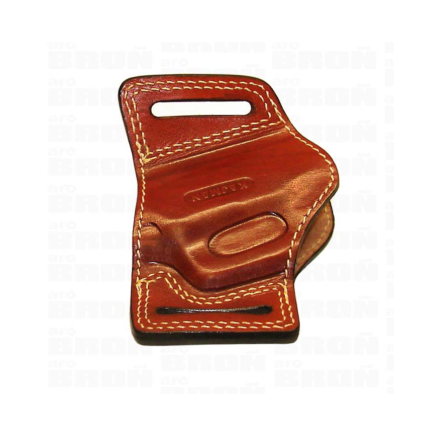 - Kabura w odpowiednim położeniu mocowana jest do pasa. Profilowana i odpowiednio wytłaczana kabura wykonana z prawdziwej skóry.