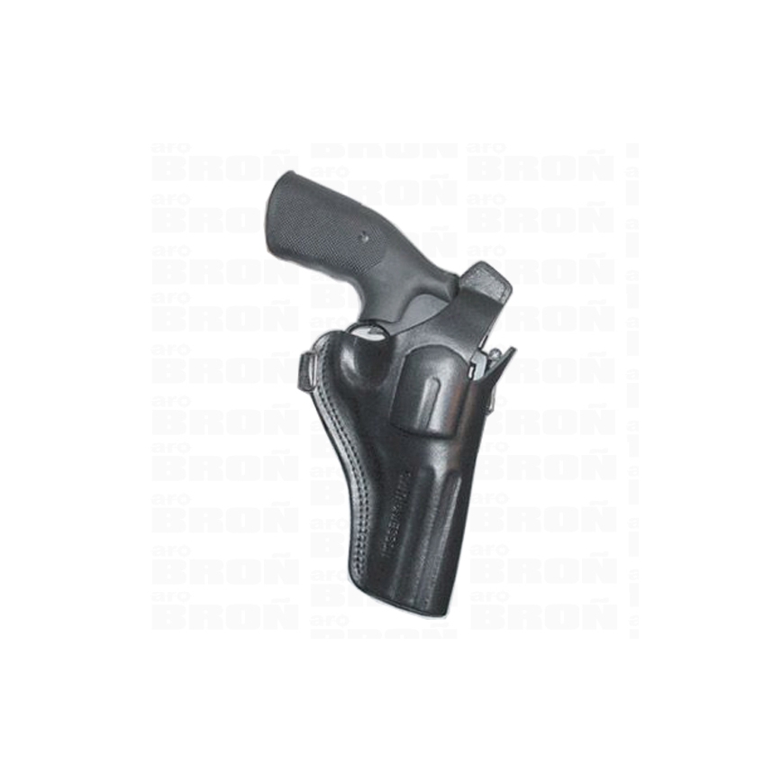 Kabura skórzana do rewolweru Smith&Wesson 586/686, Keseru 4" . Mocowana do pasa lub szelek. Kabura wykonana jest ze skóry o grubości 3 mm.i specjalnie wytłoczona pod kształt broni. Model tej kabury można wykorzystać również przy noszeniu rewolwerów palnych i gazowych o podobnym układzie kabłąka. Kabura wyposażona jest w ramki za pomocą których można podwiesić ją na szelkach pod pachą. Ten model kabury nosimy na prawej stronie pasa, jej układ (kabura operacyjna) dzięki szybkiej napie pozwala na wyjęcie broni w bardzo krótkim czasie.