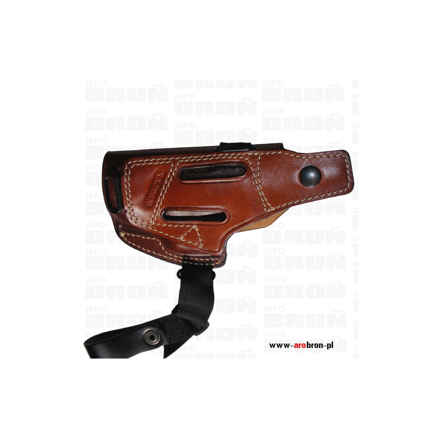 - Kabura w odpowiednim położeniu mocowana jest do szelek (ze stabilizacją do pasa) lub po odpięciu stabilizacji - mocowana na pasie. Profilowana i odpowiednio wytłaczana kabura wykonana z prawdziwej skóry.