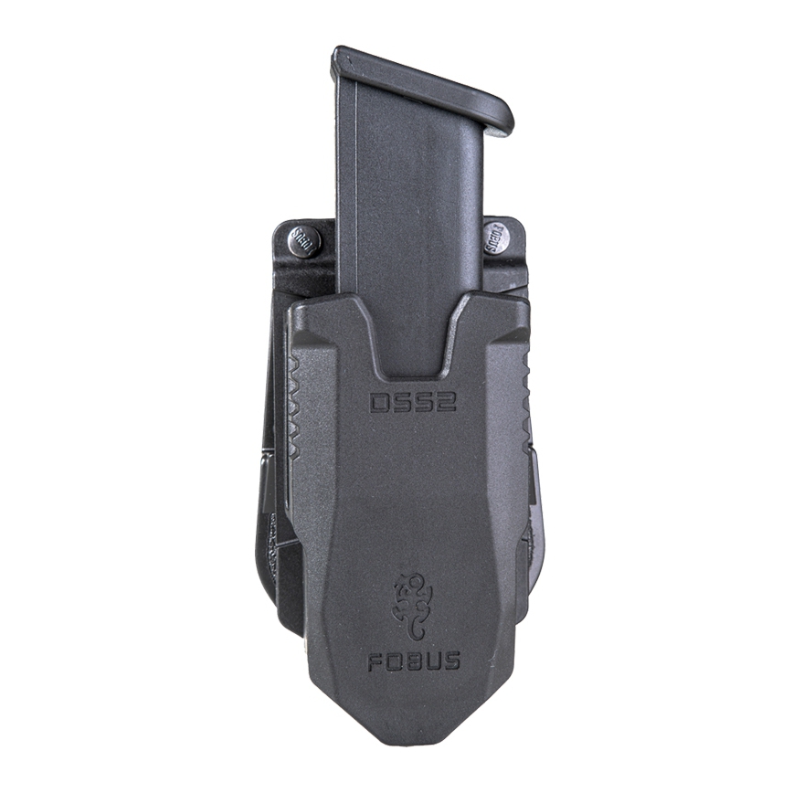 Ładownica Fobus DSS2 RPS - to model ładownicy na jeden magazynek dwurzędowy w kalibrze 9mm i .40 cal. Kabura dopasowuje się do wymiarów magazynka, jego szerokości i głębokości. W dolnej części znajduje się zawias trzymający frontową cześć ładownicy, co pozwala na dopasowanie do głębokości magazynka. Po bokach umieszczono sprężynujące blaszki trzymające magazynek niezależnie od jego szerokości.Dodatkowo dolna śruba znajdująca się od spodu magazynka pozwala na regulację siły ścisku, a co za tym idzie lepsze dopasowanie do magazynka i siły wcisku. Całość została wykonana metodą wtryskową z wysokiej jakości polimeru RX18, który charakteryzuje nieduża waga.