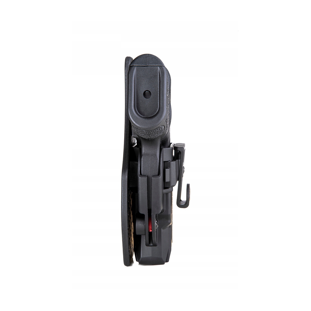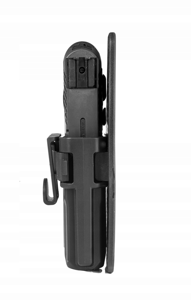 - Tył kabury (demontowana płetwa tylna) jest zrobiony z elastycznego, perforowanego materiału, który jest między pistoletem a ciałem. Osłona zapobiega ona poceniu się i nie przepuszcza potu na zamek broni. Jest ona zdejmowana, można używać kabury bez tej osłony.