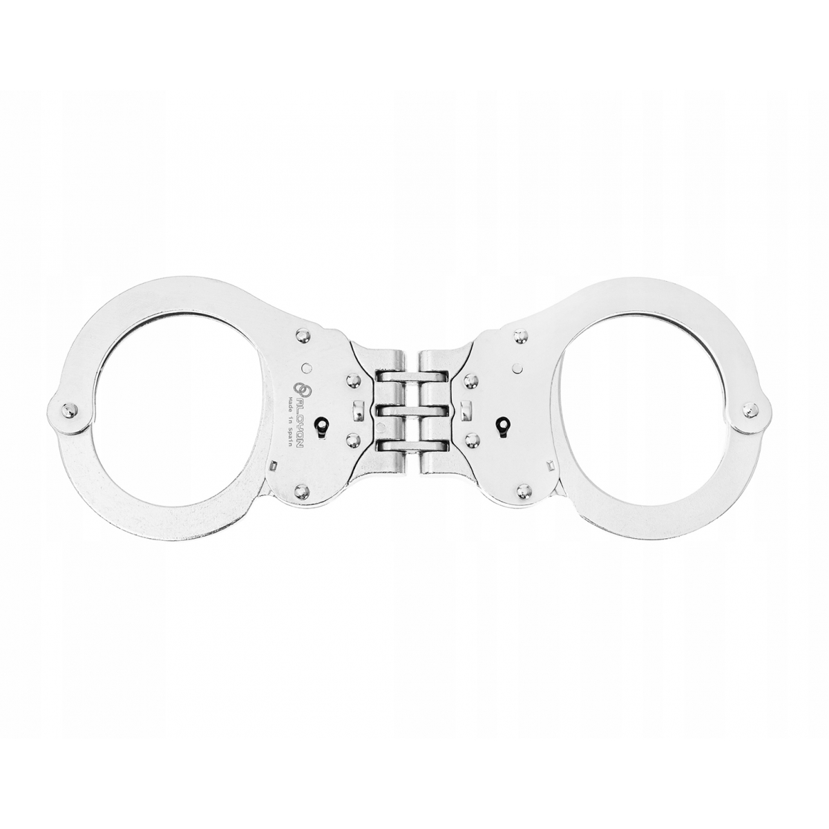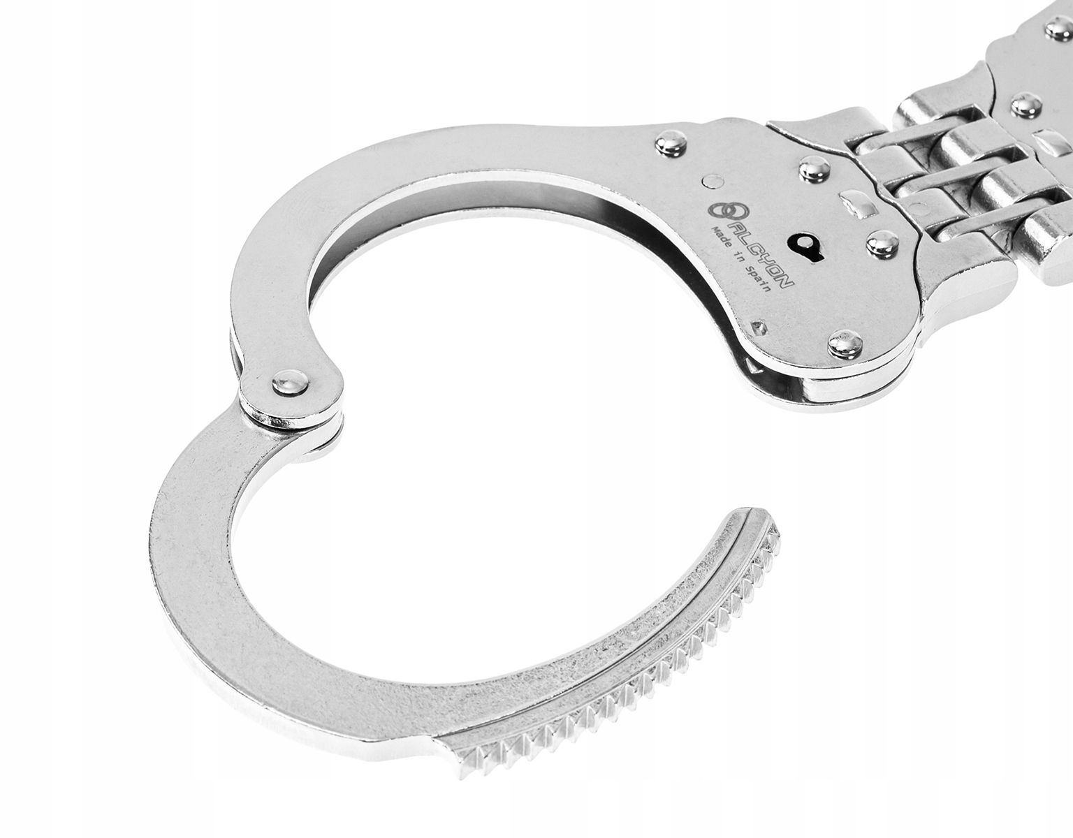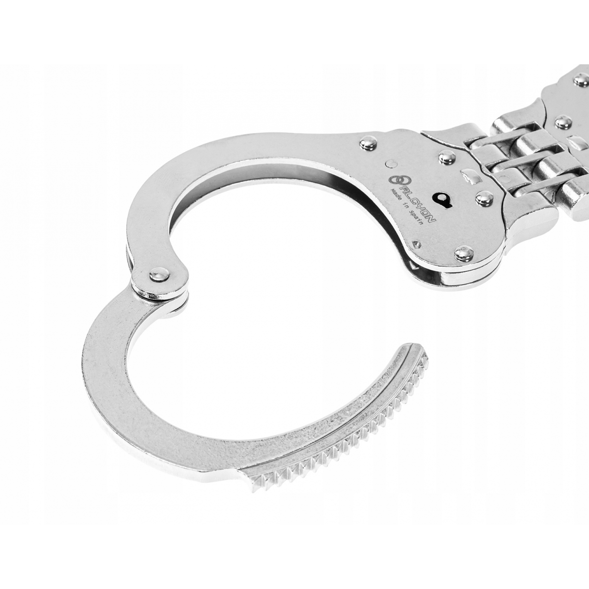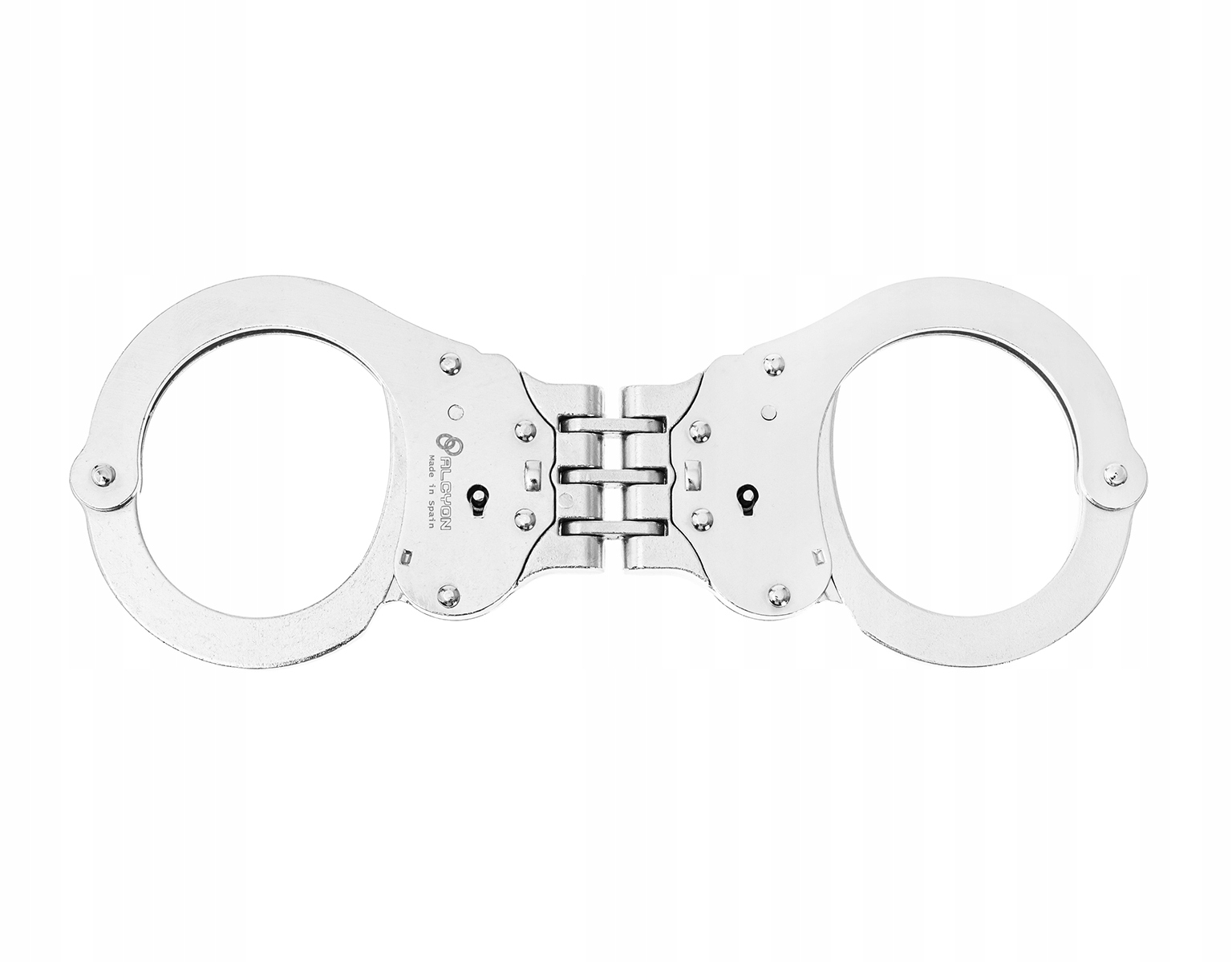 KAJDANKI zawiasowe ALCYON 5005 - profesjonalne kajdanki hiszpańskiego producenta Alcyon. Wykonane z stali nierdzewnej K-70. Przeznaczone do użytku przez służby mundurowe oraz agencje ochrony. Posiadają podwójny mechanizm zatrzaskowy. Kajdanki w skuteczny sposób ograniczają ruch dłoni, konstrukcja kajdanek zdecydowanie zmniejsza ryzyko rozpięcia.