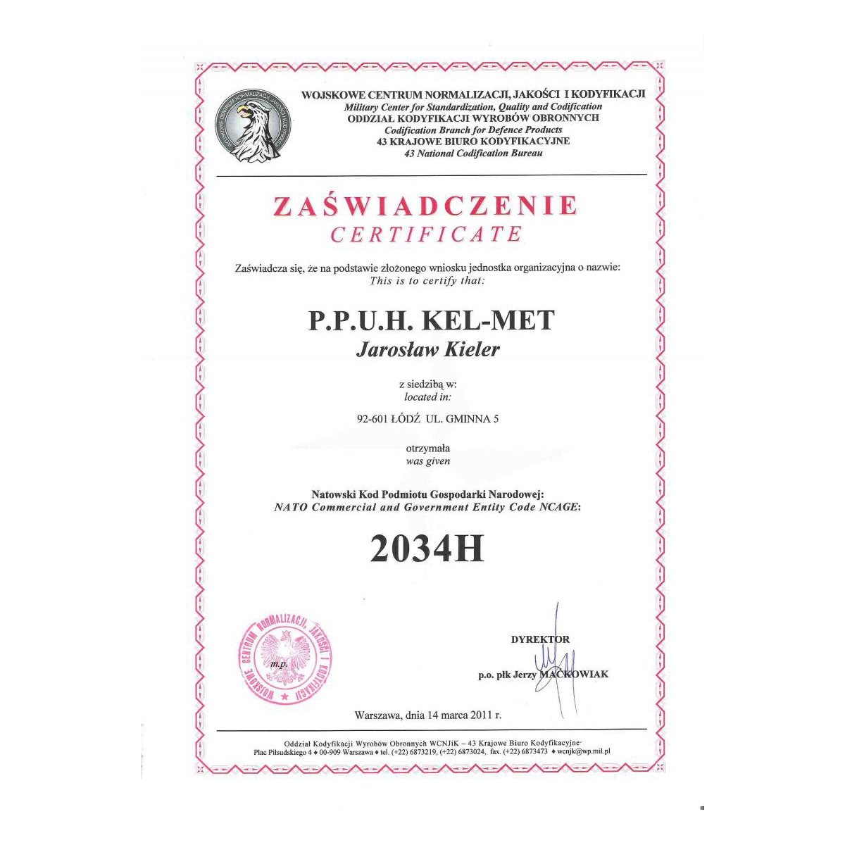 W 2011 roku Wojskowe Centrum Normalizacji, Jakości i Kodyfikacji nadało NATO'wski Kod Podmiotu Gospodarki Narodowej: NATO Comercial and Goverment Entity Code NCAGE: 2034H. Kajdankom przydzielono Numer Magazynowy NATO - NSN ( NATO Stock Number).