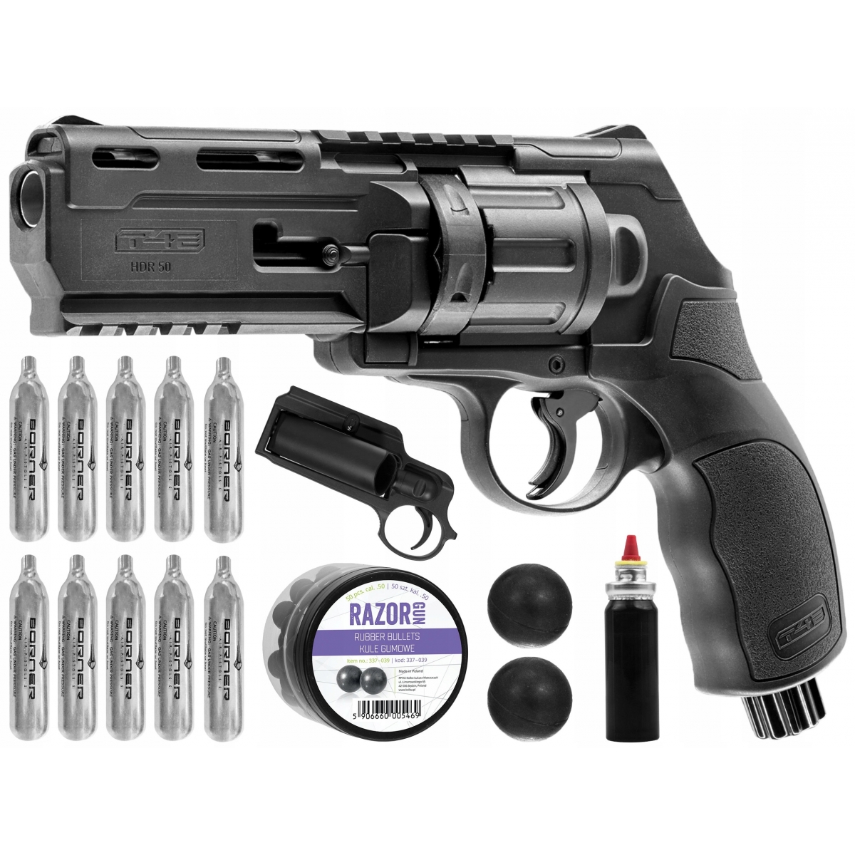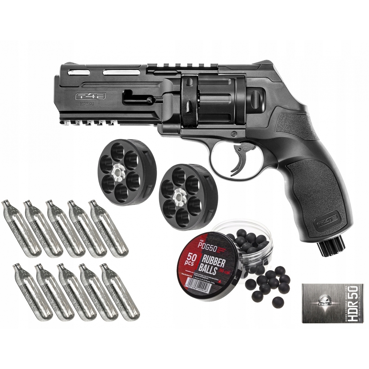 Rewolwer HDR 50 - to model służący do samoobrony, treningu czy rekreacji strzelający kulami o kalibrze .50. Wykonany został z mocnego i trwałego polimeru. Zasilany za pomocą kapsuły CO2 12g wkładanej do rękojeści. Przebita zostanie ona dopiero w momencie, kiedy użytkownik uderzy w dolną część nakrętki. Pozwala to na posiadanie ciągle założonej kapsuły CO2 bez ryzyka uszkodzenia zaworu. Rewolwer posiada magazynek na 6 kul gumowych, gumowo-metalowych, pieprzowych, proszkowych czy pocisków proszkowych. Home Defense Revolver 50 wyposażony został w stałe przyrządy celownicze szczerbinkę i muszkę. Zasięg skutecznego strzału wynosi 15m. Rewolwer został wyposażony w dwie czyny RIS: pod i nad lufą. Przed niekontrolowanym oddaniem strzały bezpiecznik umieszczony w języku spustu.