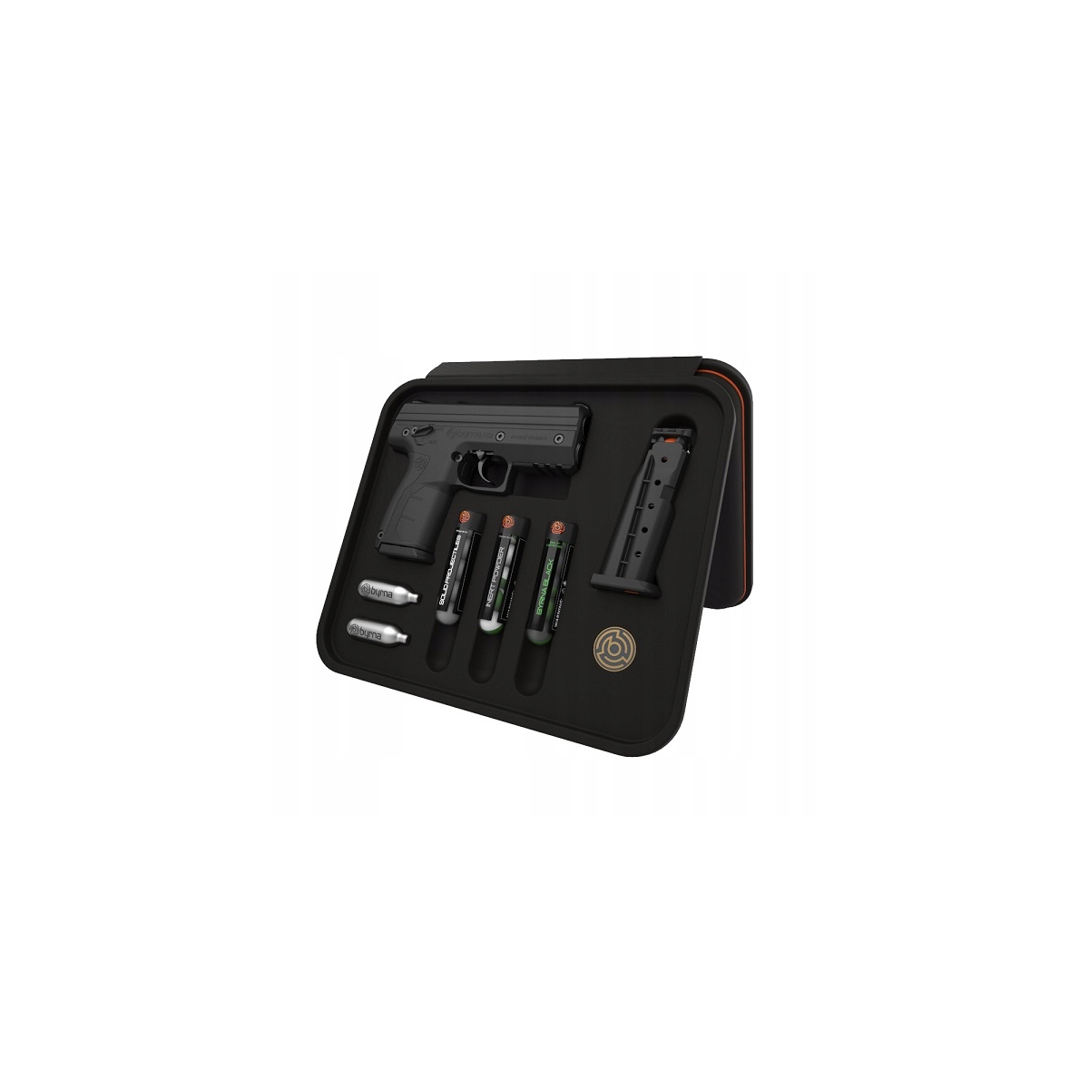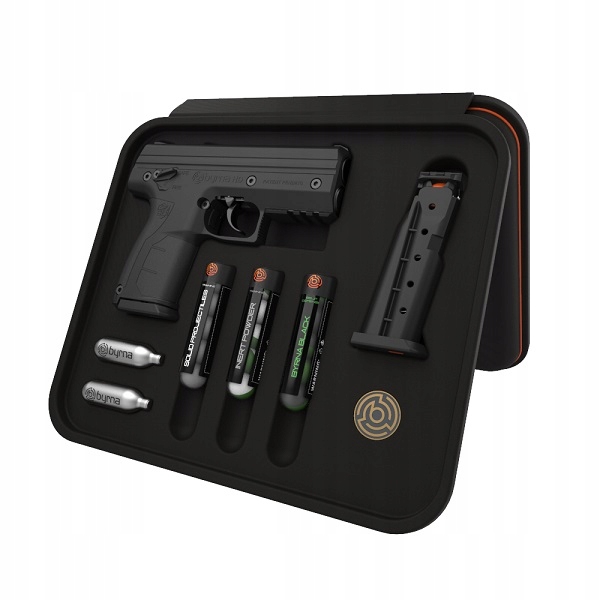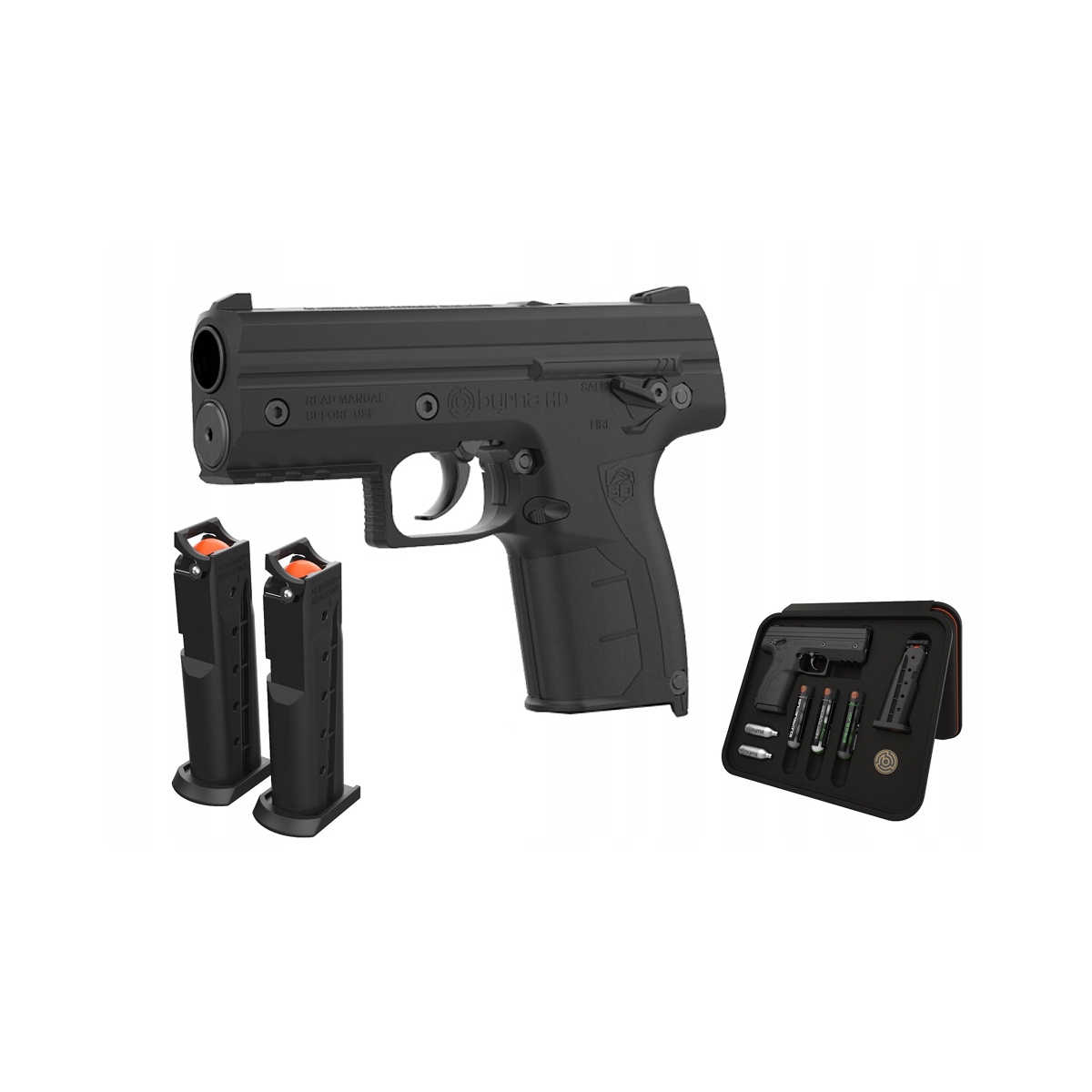 W zestawie: pistolet BYRNA HD wraz z dodatkowym magazynkiem, torba, 10 kul polimerowych .68, 5 kul treningowych pudrowych, 2 naboje CO2 8g.