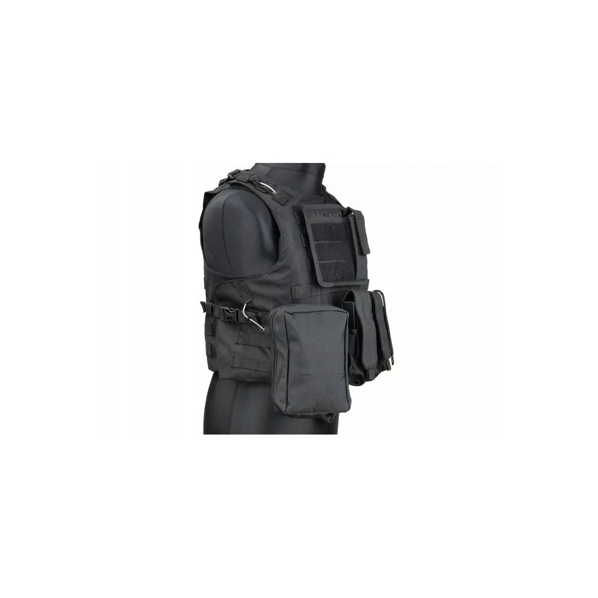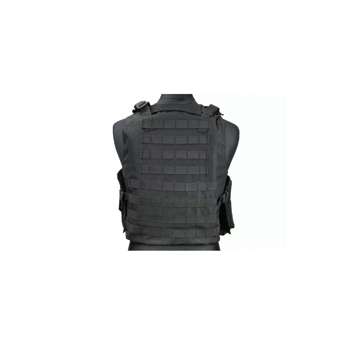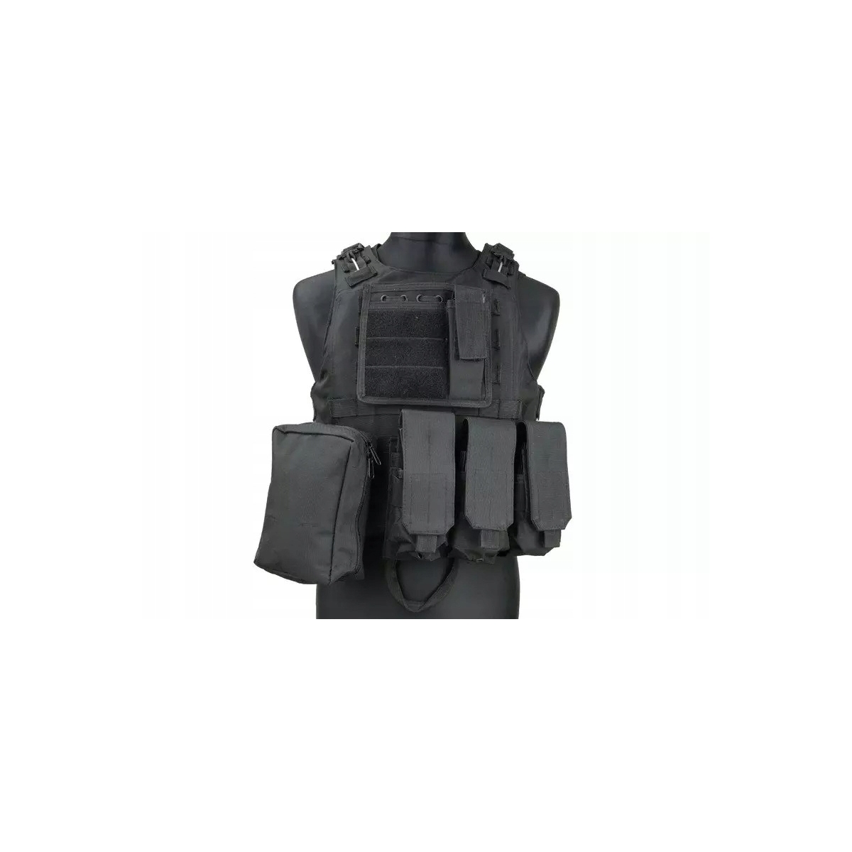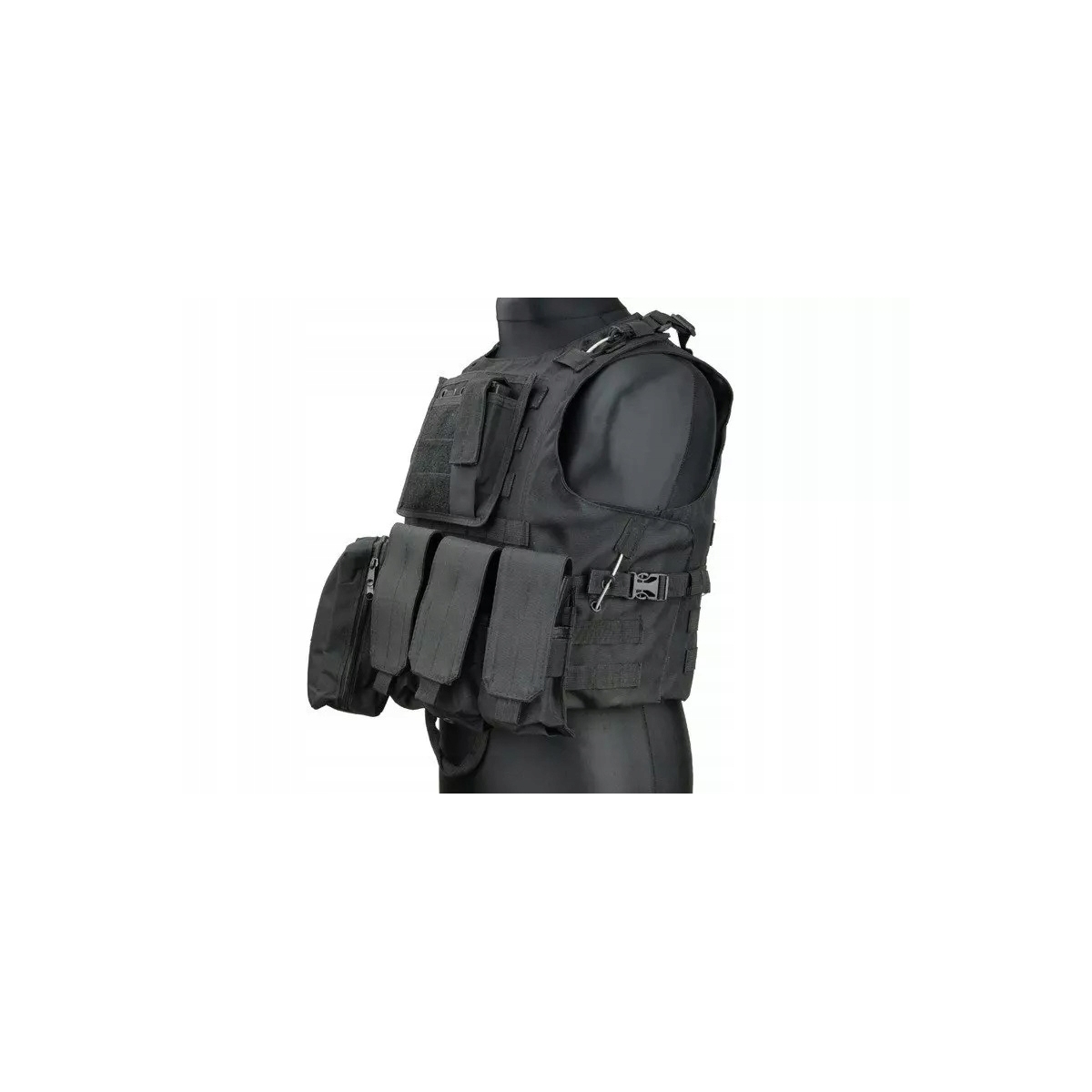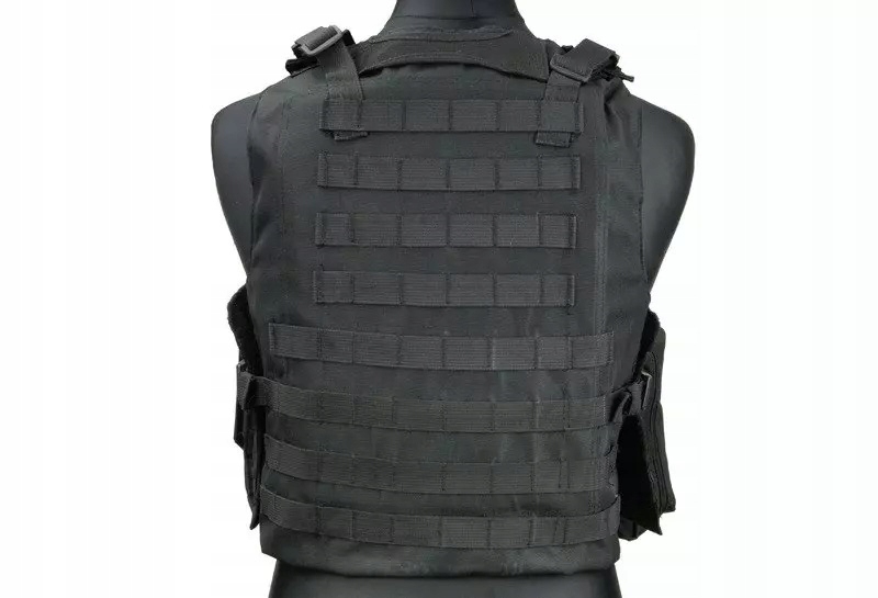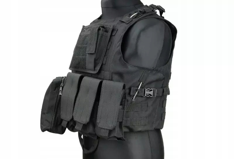 - Taktyczna kamizelka wykonana z mocnego nylonu w kolorze czarnym.