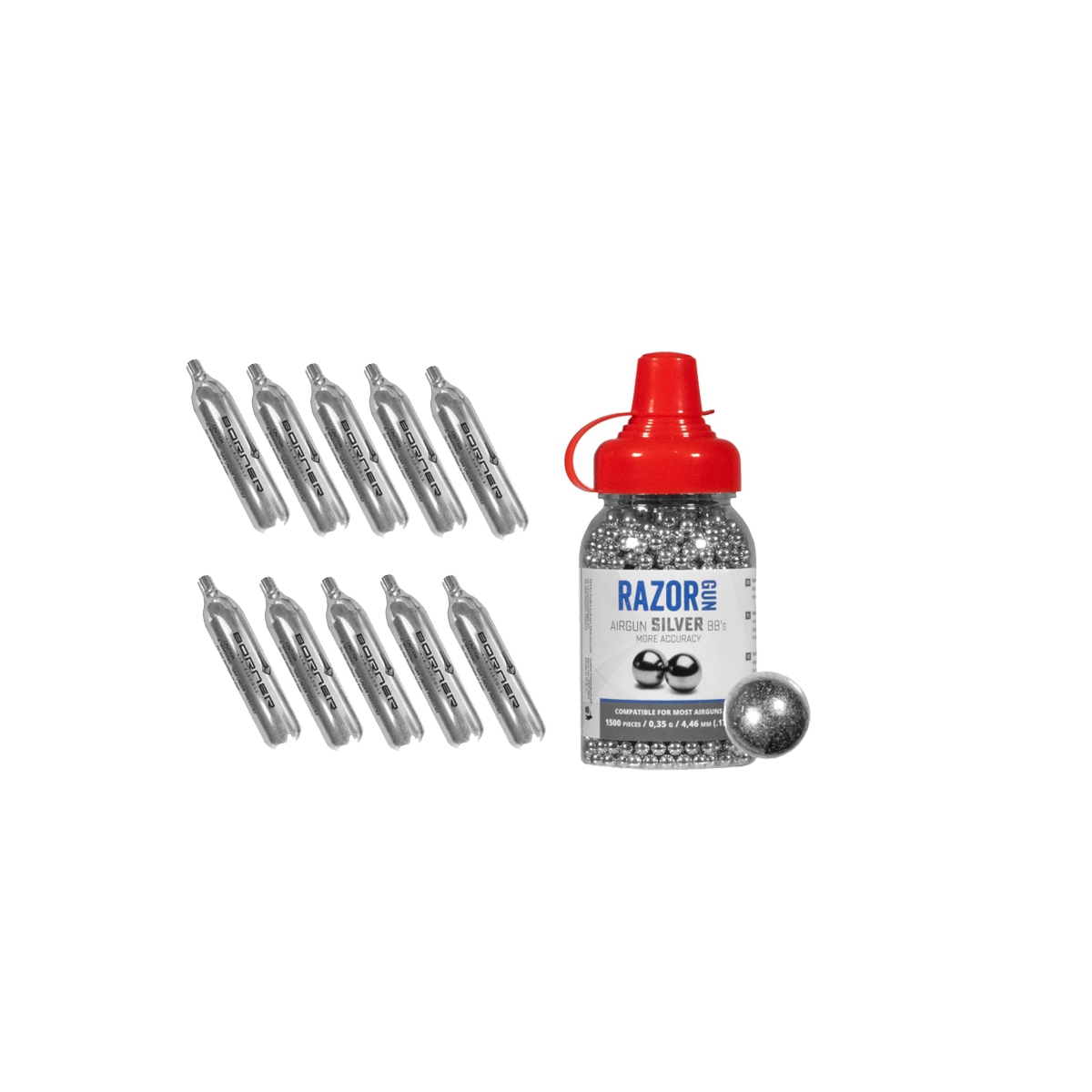 W zestawie: 10 kapsuł Borner 12g + opakowanie 1500szt śrutu BB Razor Silver 4,46 mm.