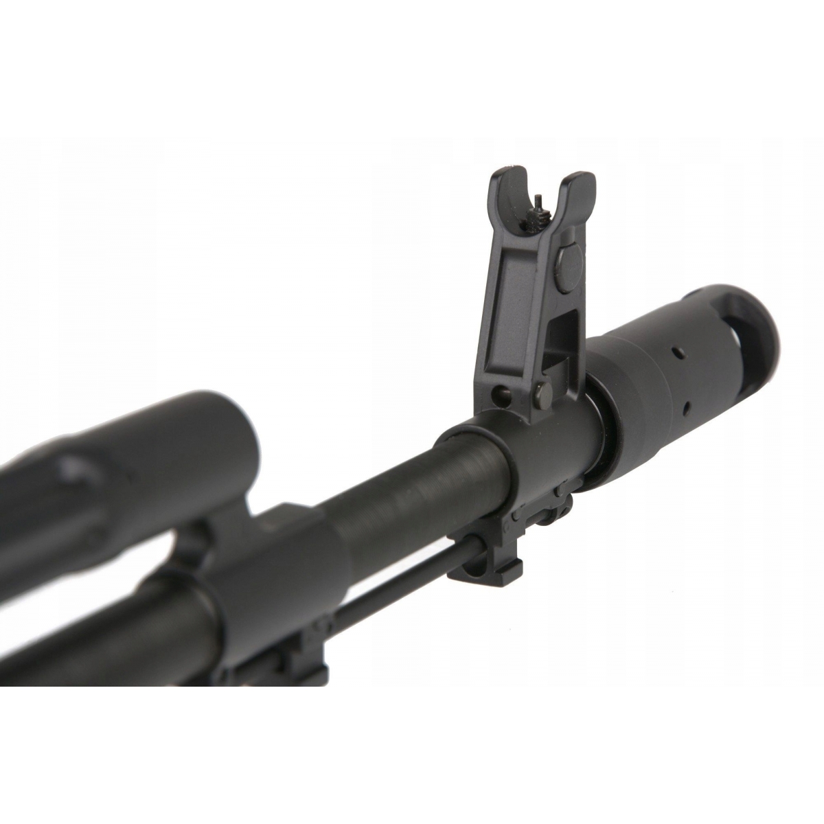 Z lewej strony korpusu umieszczono boczną szynę montażową typu "jaskółczy ogon" umożliwiającą instalację dedykowanych celowników optycznych bądź dodatkowych szyn RIS. Dostęp do dźwigni regulacji systemu Hop-Up uzyskujemy po odciągnięciu rączki przeładowania. Pokrywa zamocowana została na jednym zatrzasku, co pozwala na jej błyskawiczny demontaż i wymianę źródła zasilania. Metalowy gearbox v3 sprawia, że karabinek wystrzeliwuje kulki z prędkością 440 FPS.