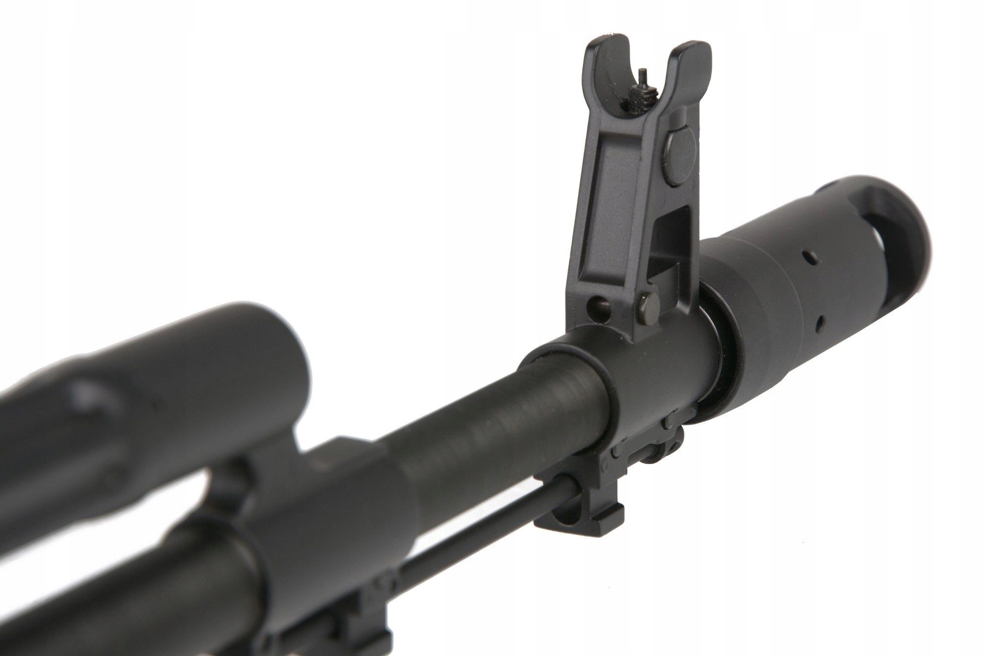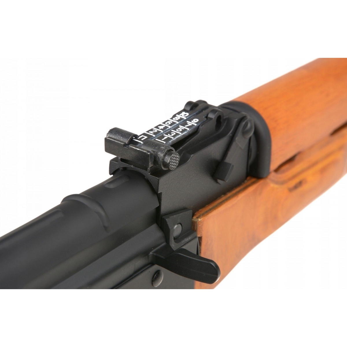 Karabinek szturmowy ASG Cyma - Elektryczna replika CM048 wykonana ze stali, metalu drewna i tworzywa sztucznego. Korpus pokrywa komory zamkowej, tłumik płomienia oraz rura gazowa wykonane są ze stali, natomiast kolba, nakładka rury gazowej, chwyt oraz magazynek wykonano z wytrzymałego tworzywa sztucznego. Z prawej strony znajduje się skrzydełkowy selektor trybu ognia/bezpiecznik.