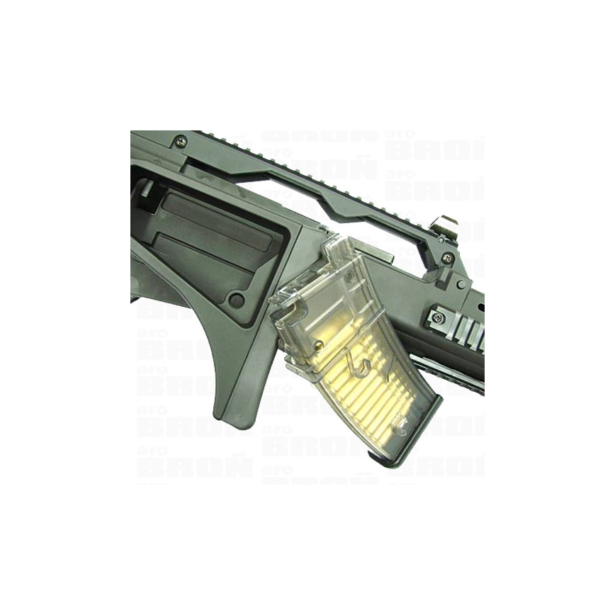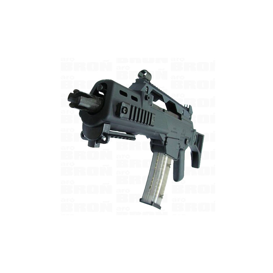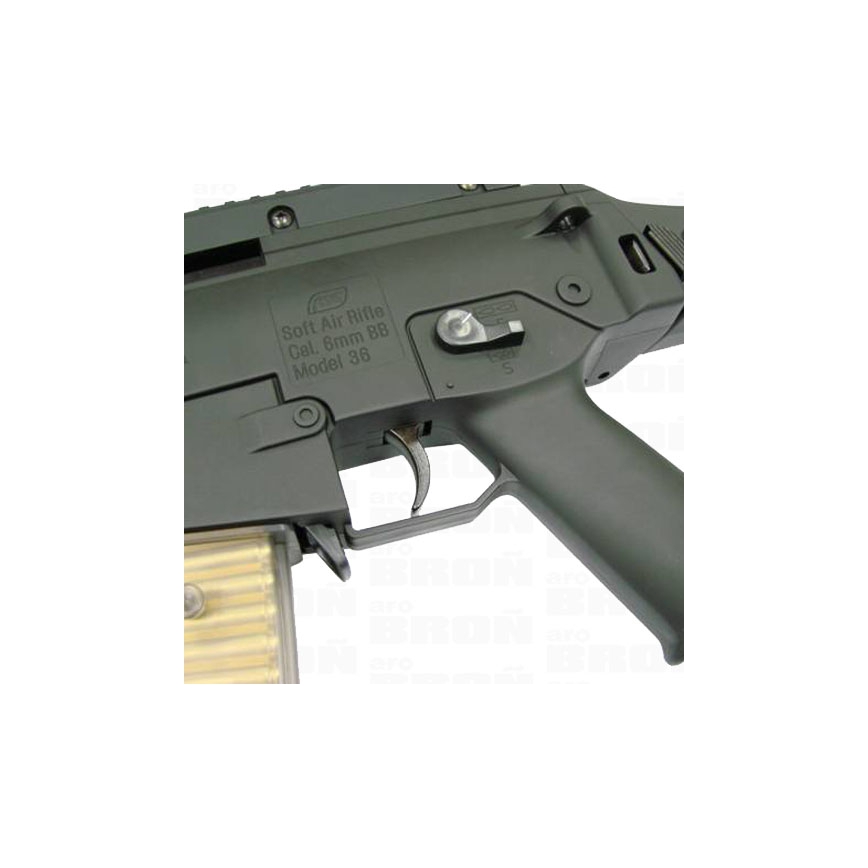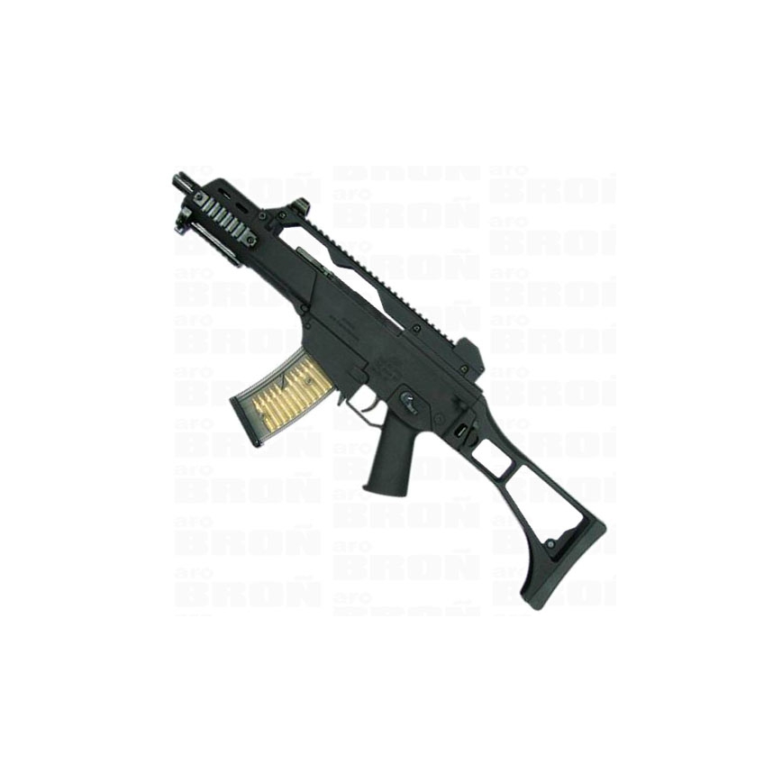 Replika ASG doskonałego niemieckiego karabinka szturmowego HK G36. Karabinek posiada składaną na bok kolbę. Magazynek z zasobnikiem na 200 kulek BB kal. 6mm. Dodatkowo szyna RAS do zamontowania dodatkowego oprzyrządowania. Korpus wykonano z wytrzymałego tworzywa sztucznego. Przyrządy celownicze, spust oraz podrzutnik z metalu. Karabinek posiada system otworów do zaczepienia pasa nośnego.Dane techniczne: