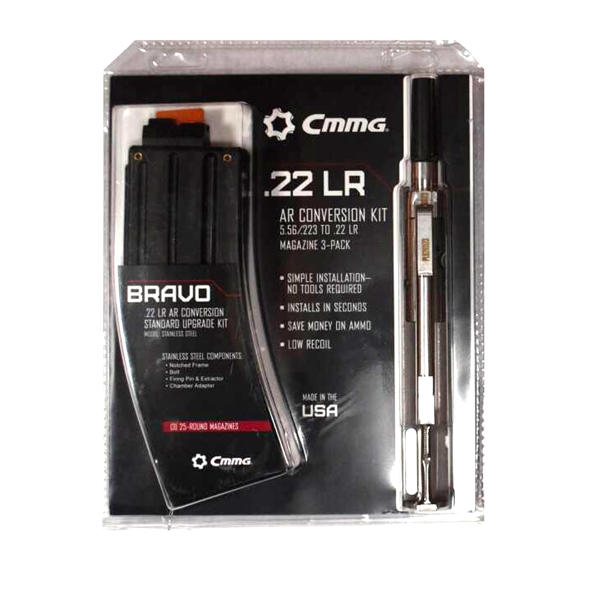 Konwersja CMMG Bravo pasuje do każdego karabinka AR-15 w standardzie Mil-spec. Nie wymaga ingerencji rusznikarza i specjalistycznej wiedzy. Montaż konwersji polega jedynie na wymianie zespołu suwadła i zamka oraz podpięciu 25- nabojowego magazynka CMMG w kalibrze .22LR (3 w zestawie).