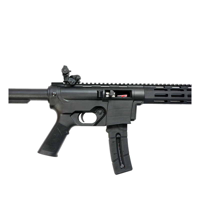 Karabinek Rossi 7022 Delta wyposażono w lufę o długości 16,25” zakończoną tłumikiem płomienia, 6-cio pozycyjną wysuwaną kolbę oraz łoże ze slotami M-LOK pozwalające na montaż dodatkowych akcesoriów. W tylnej części kolby karabinka znajdziemy dodatkowy slot QD do montażu zawieszenia taktycznego. Całość karabinka utrzymana jest w taktycznej, czarnej kolorystyce.