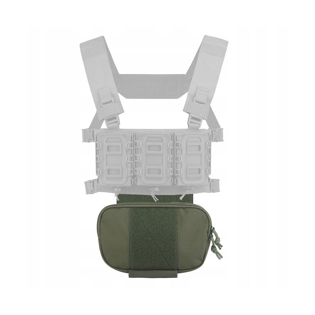 Kieszeń mocowana jest rzepem od wewnętrznej strony chest riga lub pod klapą plate carriera. Przedni panel velcro pozwala na przytwierdzenie różnych emblematów. Elastyczne paski na dole kieszeni umożliwiają przenoszenie stazy taktycznej.