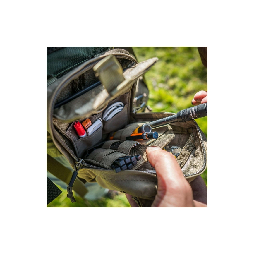 Zewnętrzna kieszeń o powiększanej objętości, zapina się na rzep. W środku posiada D-ring oraz trzy elastyczne pętle. Na froncie naszyto panel vrelcro ułatwiający personalizację za pomocą odpowiednich naszywek. Pouch posiada dwa elastyczne ograniczniki zapobiegające pełnemu otwarciu kieszeni i ewentualnemu wysypaniu się przenoszonych przedmiotów. Saszetka jest kompatybila z systemem MOLLE/PALS.