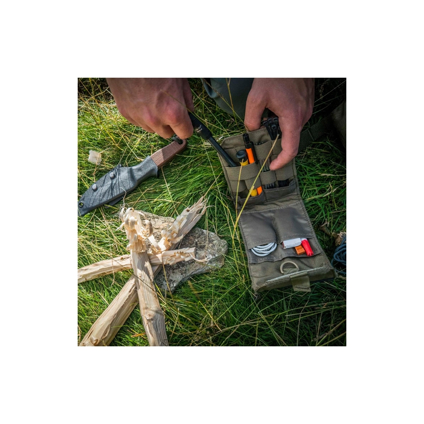 Wykonana z Cordury®, praktyczna kieszeń, która doskonale sprawdzi się do przenoszenia drobnej elektroniki, przydatnych narzędzi czy artykułów medycznych. W zamykanej na dwukierunkowy zamek komorze głównej znajdują się dwie mniejsze kieszonki, pętla do mocowania drobiazgów, kiszeń z suwakiem oraz cztery elastyczne taśmy. Na jednej ścianie naszyto duży panel velcro z odczepianym organizerem, który może posłużyć jako samodzielny portfel.