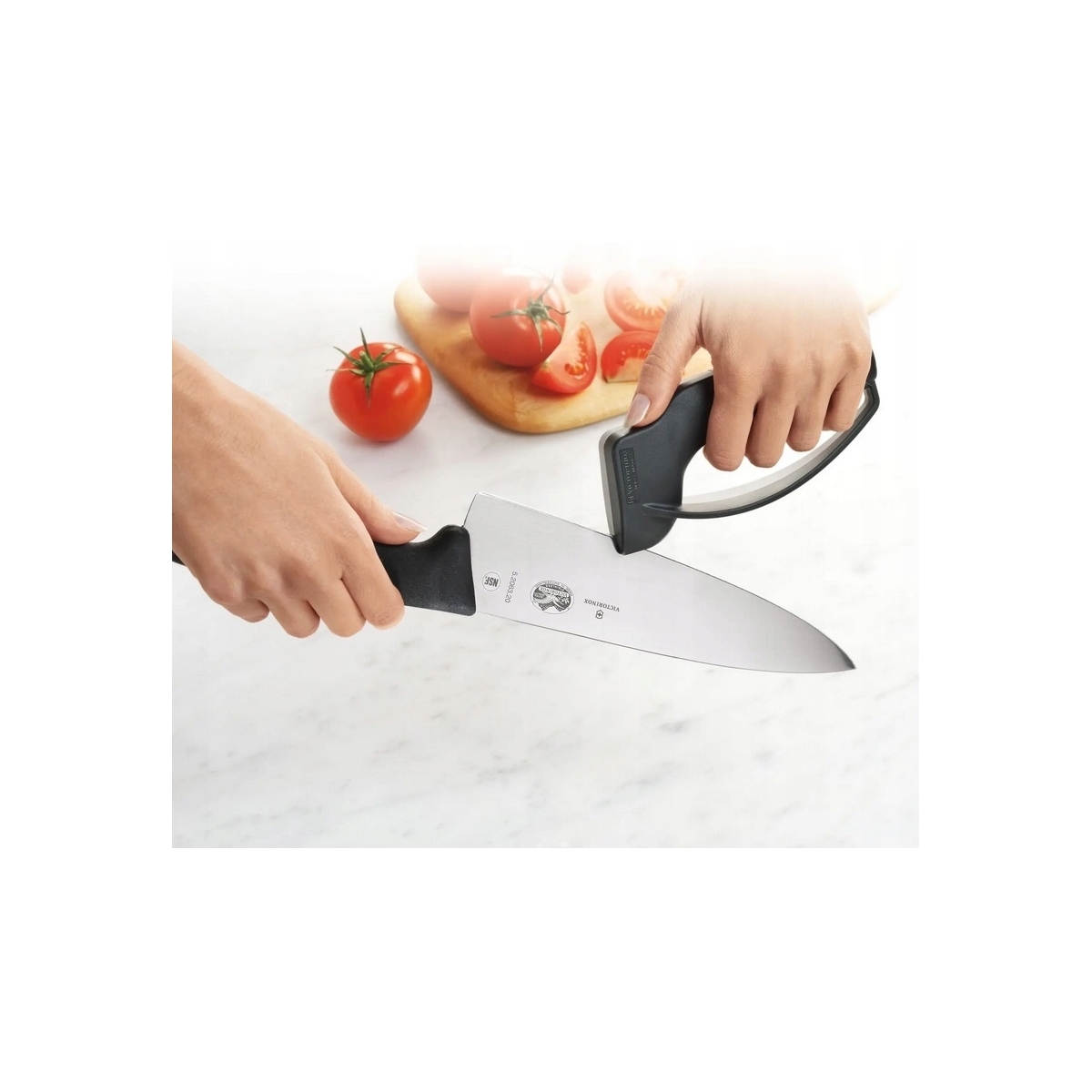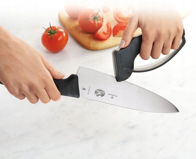 Ostrzarka do noży Victorinox 7.8715 SHARPY - Ergonomiczna ostrzarka do noży. Zapewnia łatwe, szybkie i bezpieczne ostrzenie wszystkich modeli noży o prostej krawędzi ostrza, gwarantując długotrwałą precyzję krojenia. Jej ergonomiczna konstrukcja przekłada się na najwyższe bezpieczeństwo obsługi. Mechanizm ostrzący narzędzia składa się z małych, metalowych, karbidowych płytek w kształcie litery V umieszczonych pod optymalnym kątem w zewnętrznej strukturze ostrzarki. To jedno z tych akcesoriów, które będą służyły Ci przez lata.