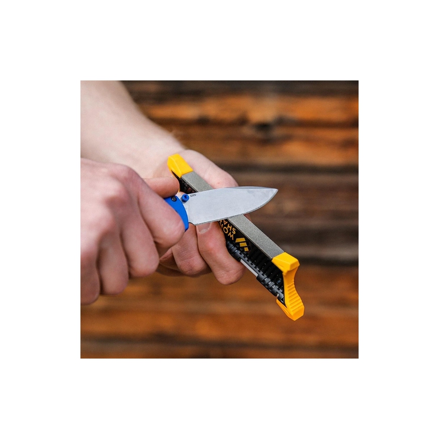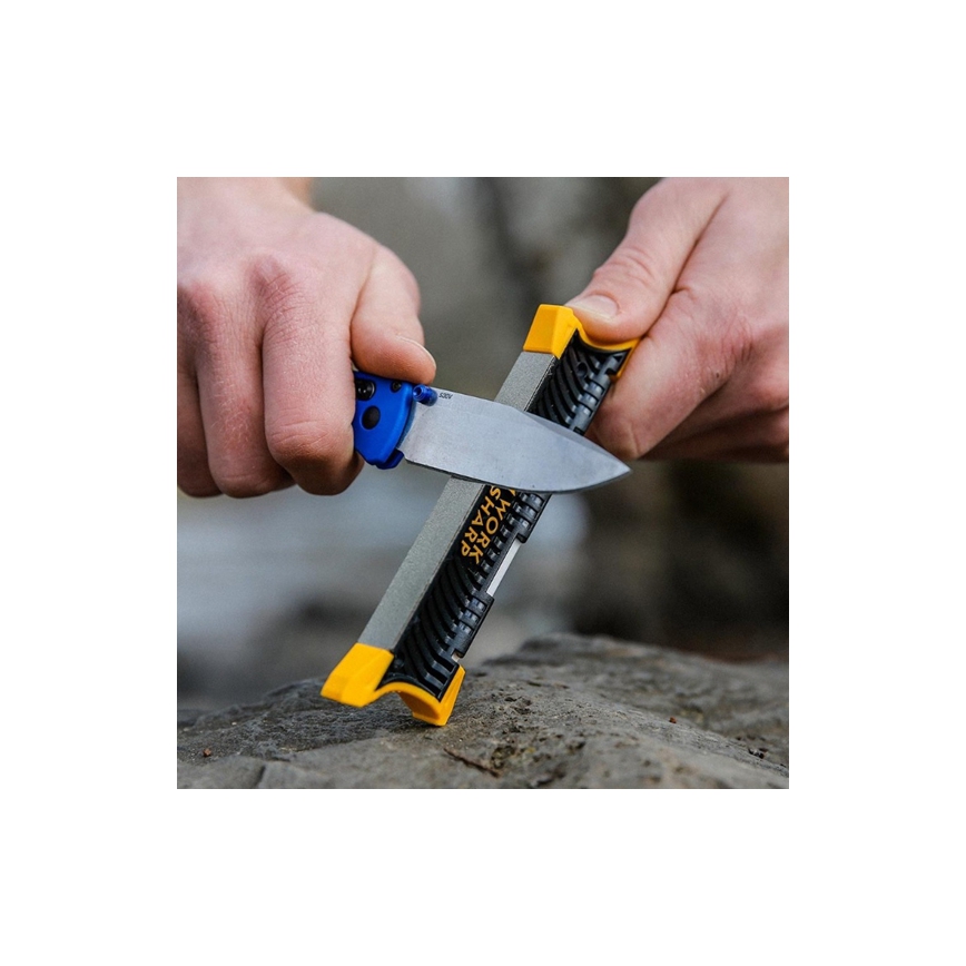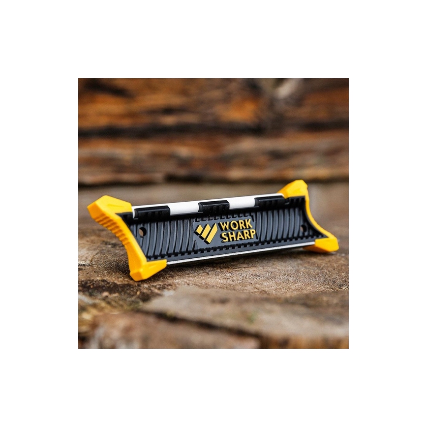 Ostrzałka kieszonkowa Work Sharp WSGPS to kompaktowe urządzenie, które zostało wyposażone w dwie powierzchnie ostrzące w postaci diamentowej płytki, oraz ceramicznego pręcika. Wyróżnia ją zamocowanie prowadnic kątowych ułatwiających ostrzenie.