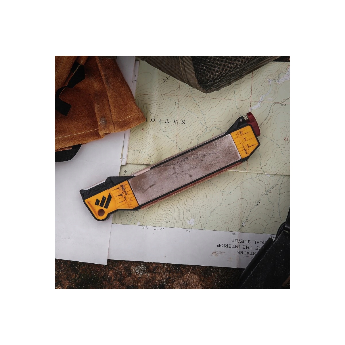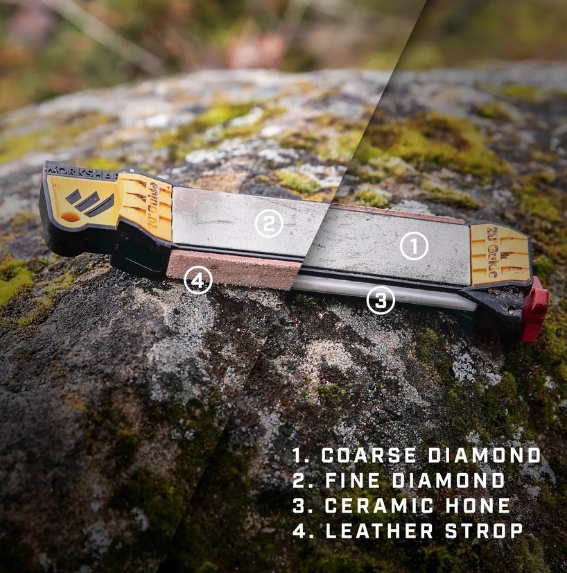 Work Sharp Guided Field Sharpener wyposażona w aż 5 stref ostrzenia, stałe prowadnice kątowe, klucze do odkręcania grotów strzał oraz przedział na krzesiwo lub rozpałkę.