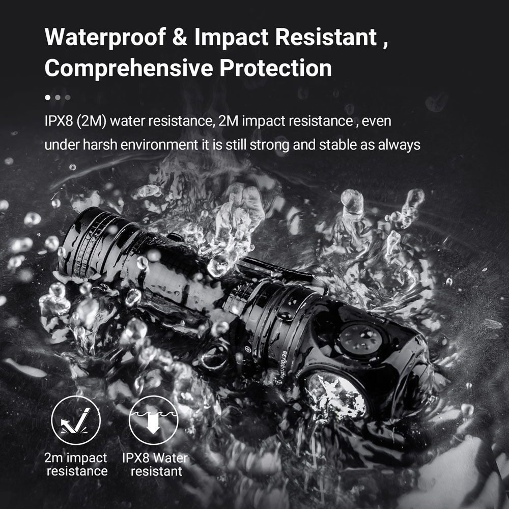 - Latarka posiada klasę wodoodporności IPX8 pozwalającą na zanurzenie w wodzie na głębokość 2 metrów na okres 30 minut.