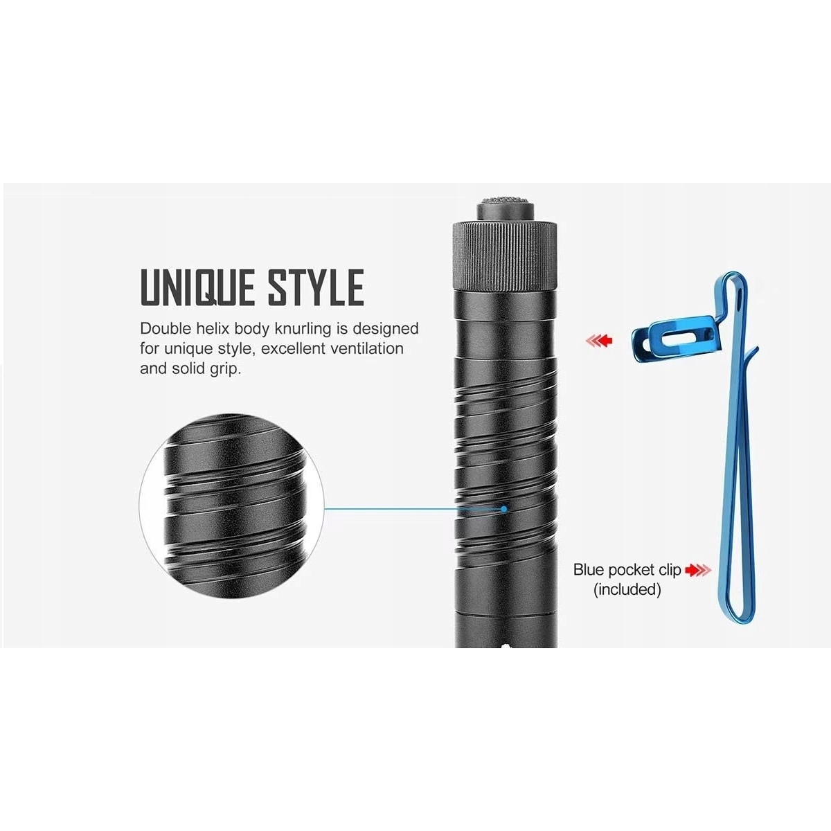 Latarka jest zasilana jedną baterią AA, co czyni ją niezwykle praktyczną i łatwą w użytkowaniu. Dwustronny klips pozwala na wygodne mocowanie do kieszeni, pasa lub ekwipunku, a taktyczny włącznik tylni zapewnia szybki i intuicyjny dostęp do światła.