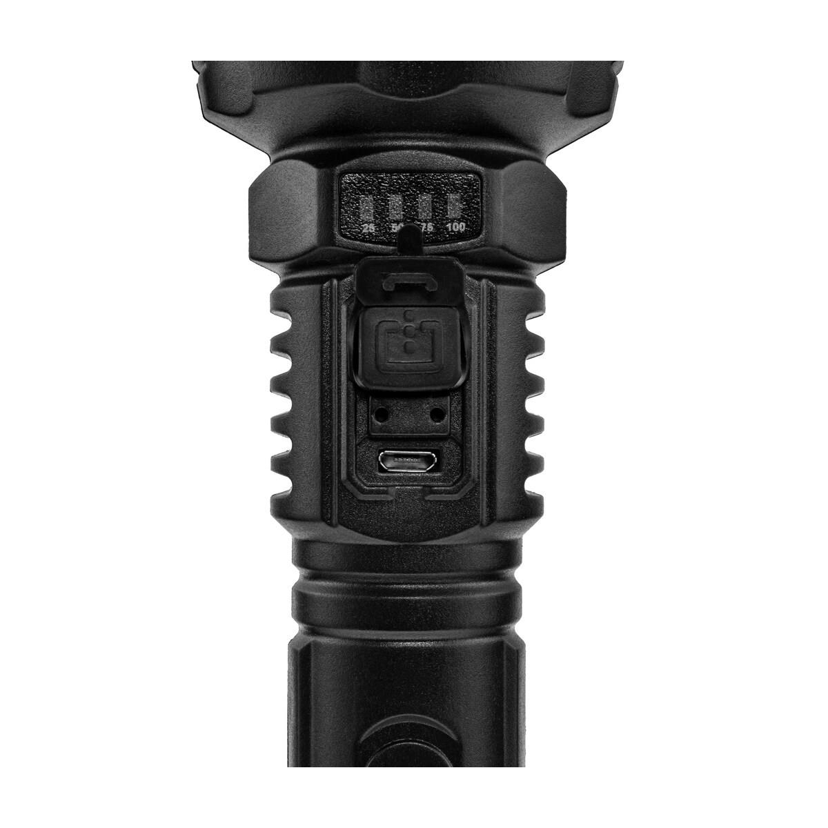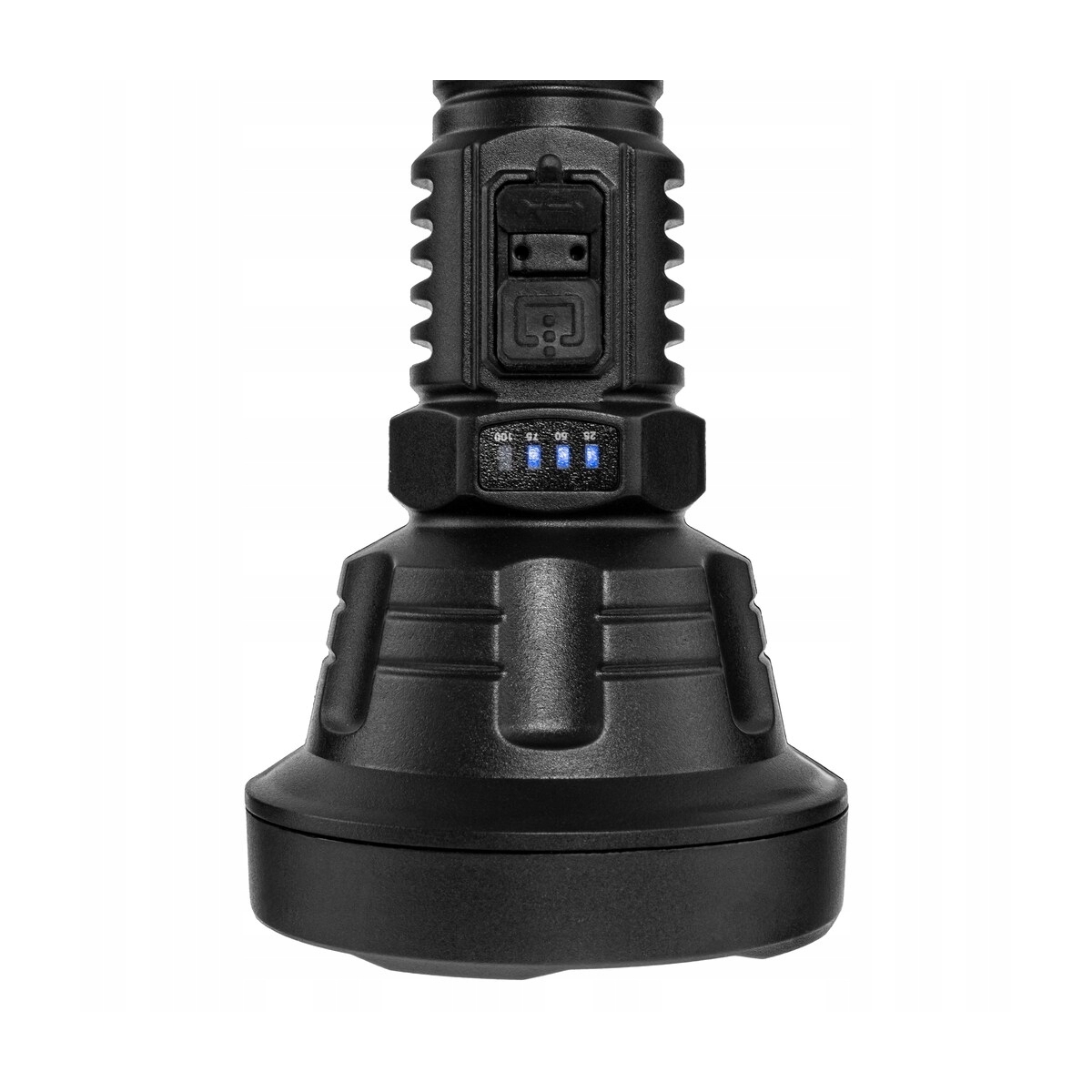 ✅ Latarka zasilana jest wbudowanym akumulatorem 18650 Li-on. Do zestawu dołączony jest kabel Micro-USB do ładowania. Poziom naładowania sygnalizują 4 diody umieszczone nad włącznikiem.