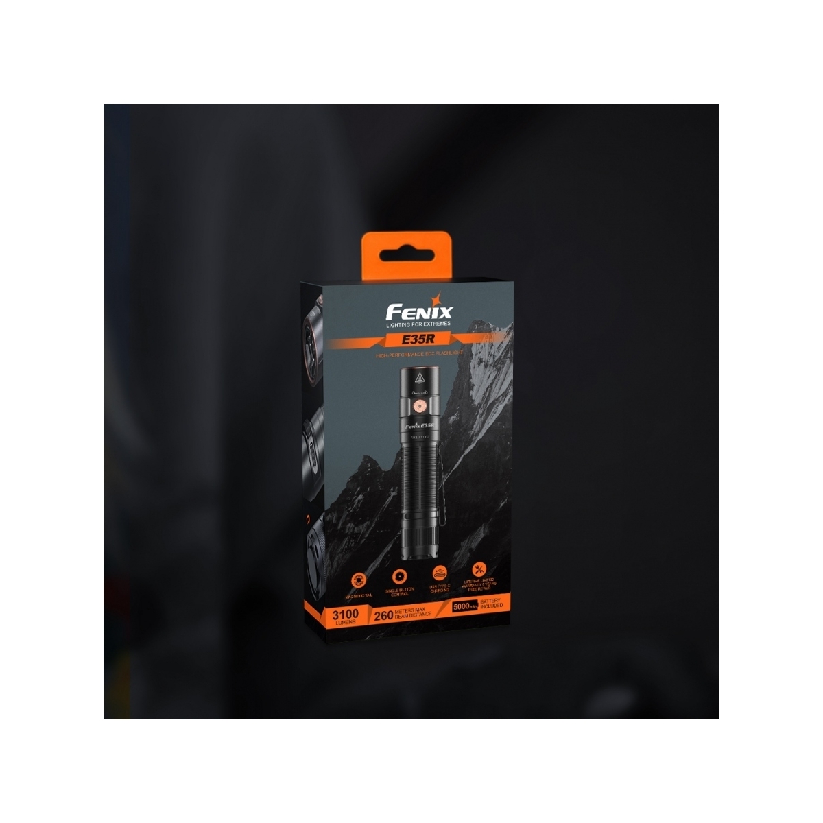 Fenix E35R zasilany jest za pomocą akumulatora 21700 o pojemności 5000 mAh. ARB-L21-5000 to obecnie najbardziej pojemne ogniwo do zasilania latarek, zapewniające znacznie dłuższą pracę oraz stałą wydajność prądową.