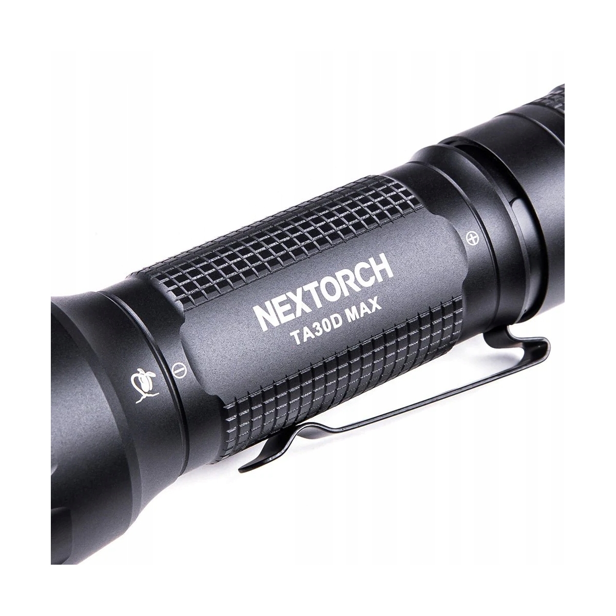 NEXTORCH TA30D MAX to zaawansowana latarka taktyczna przeznaczona dla użytkowników wymagających najwyższej wydajności — operacji poszukiwawczych, działań służb specjalnych oraz wyposażenia taktycznego. Wyposażona w pojedynczą, wysokowydajną diodę 9-rdzeniową oraz system Ultra Thermal Buffer (U.T.B) utrzymuje pełną moc 4000 lumenów przy kontroli temperatury chwytu. Model posiada opatentowany system One-Step-Strobe (natychmiastowy tryb stroboskopowy), magnetyczny pierścieniowy włącznik ogonowy, obracany pierścień trybów oraz wytrzymałą konstrukcję z ramką z nano-ceramiki umożliwiającą rozbijanie szkła. Latarka została zaprojektowana do działania w trudnych warunkach — jest wodoszczelna oraz odporna na upadki.