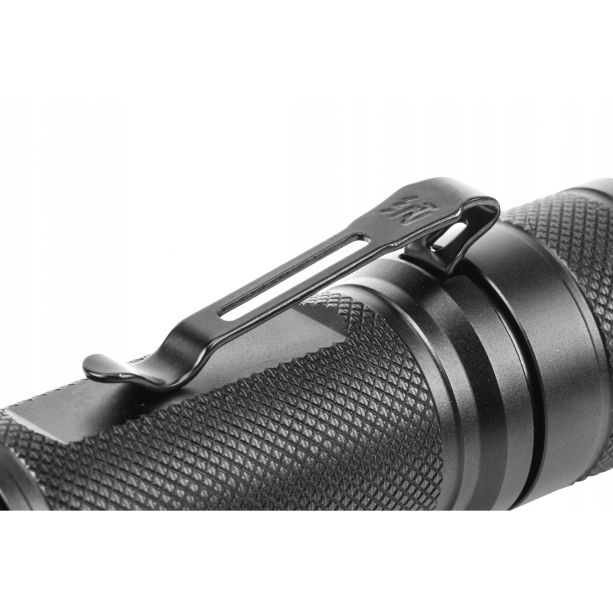- Zdejmowany stalowy klips pozwala na przypięcie latarki do dowolnej krawędzi odzieży lub wyposażenia.