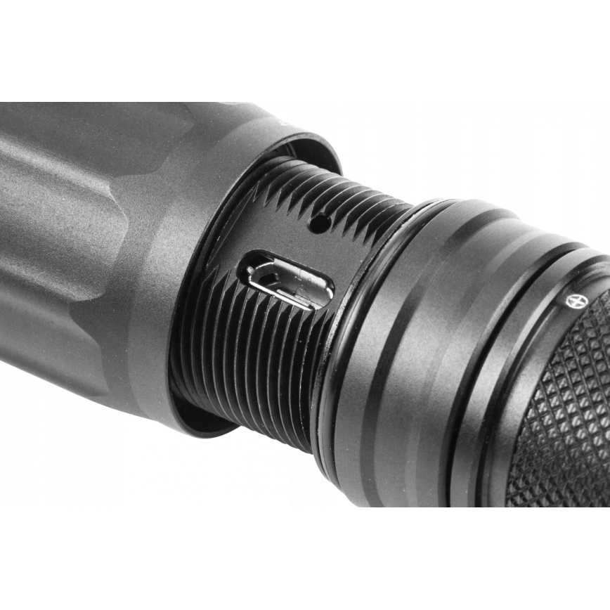 Ładowanie latarki odbywa się przez port micro-USB ukryty pod głowicą, wyposażony w diodę informującą o naładowaniu akumulatora.