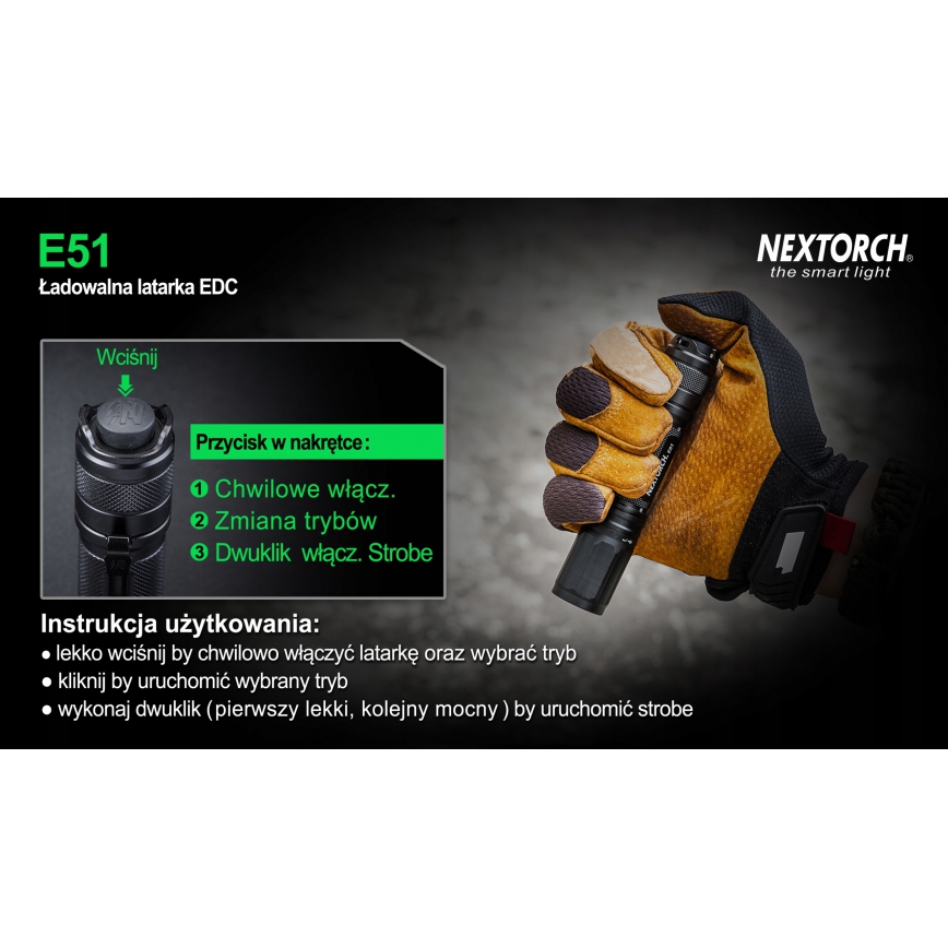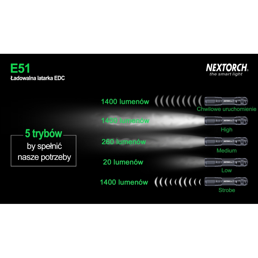 - Nextorch E51 pracuje w 5 trybach: high/medium/low/strobo oraz chwilowe uruchomienie.