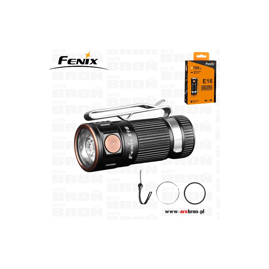 Fenix E16 to mała latarka do użytku codziennego.. Wyposażona została w diodę Cree XP-L HI o mocy 700 lumenów. Zastosowana soczewka o grubości 3mm w połączeniu z reflektorem orange peel pozwala na osiągnięcie odległości strumienia światła 142 metrów.
