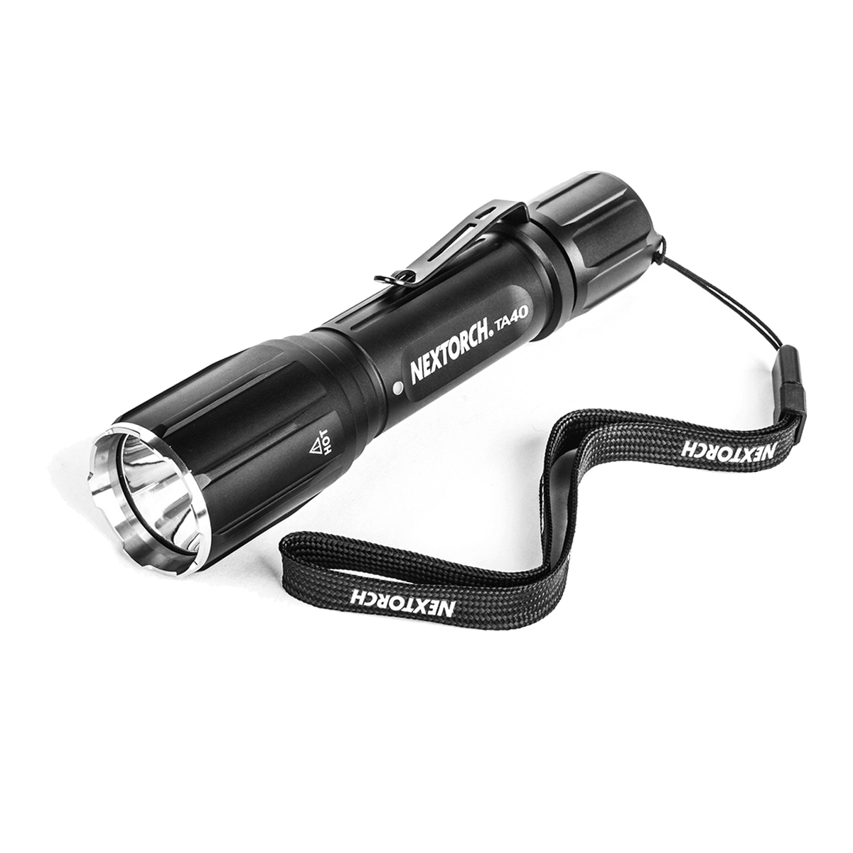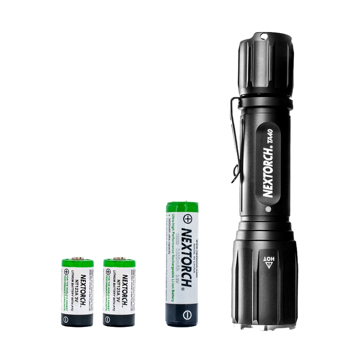 W zestawie: latarka NEXTORCH TA40, 2 baterie CR123 Energizer (nieładowalne), kabel USB do ładowana, 2x oring, pasek na rękę, stalowy klips.