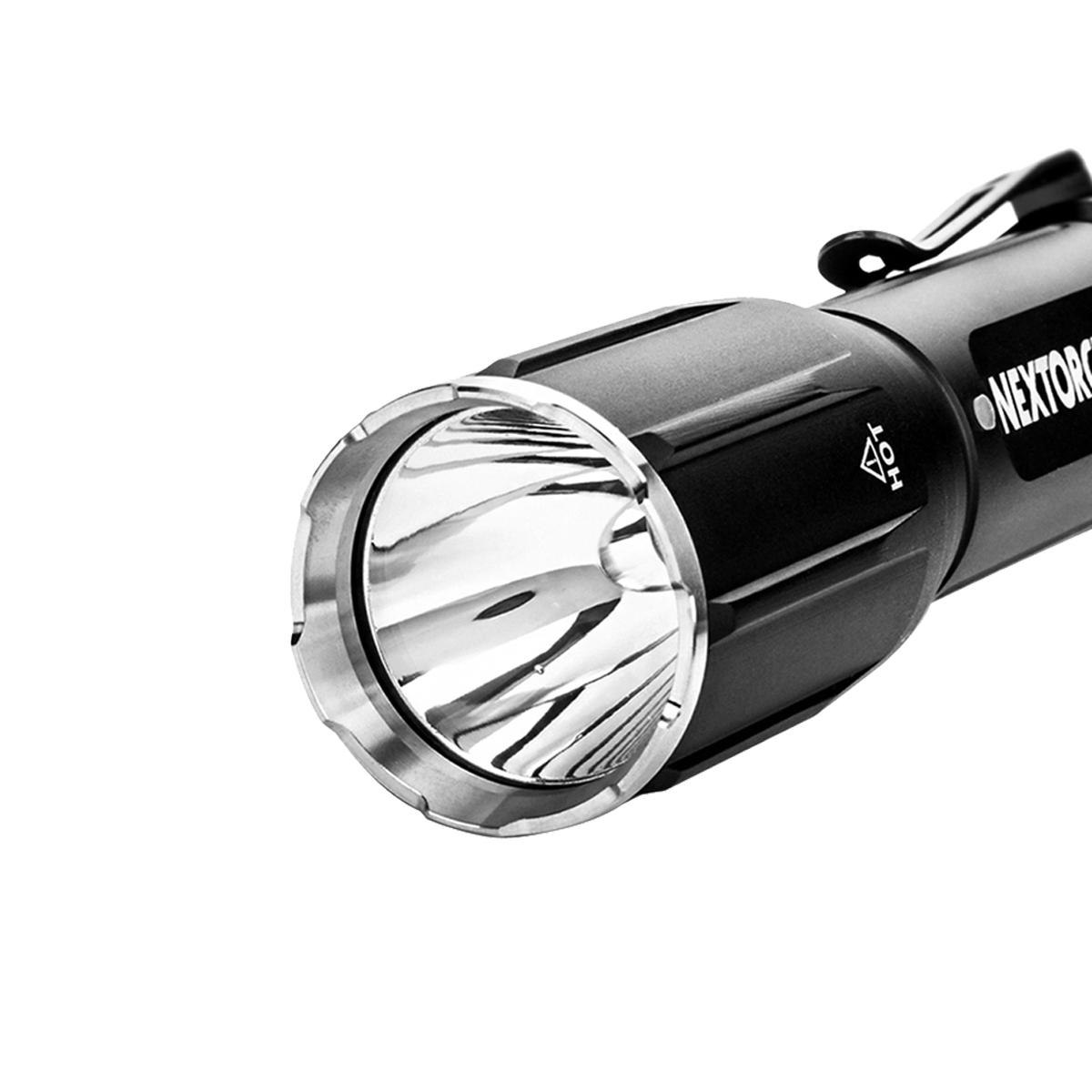 - Latarka posiada zdejmowany stalowy klips oraz pasek na rękę zaczepiany o otwór umieszczony na końcu tubusu.